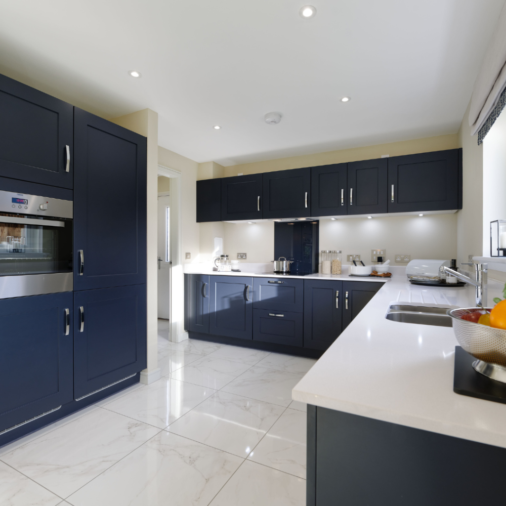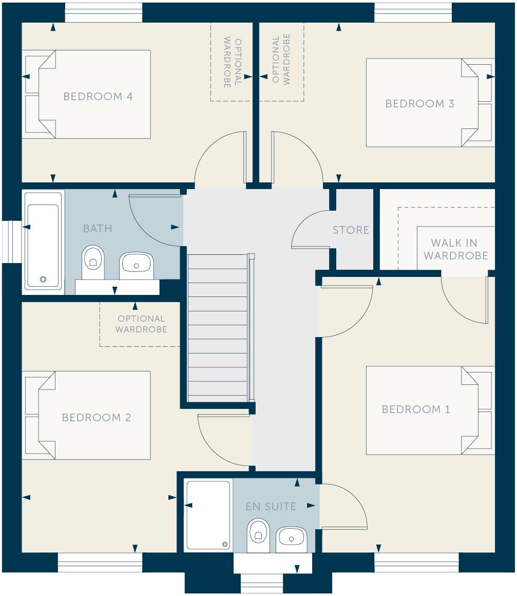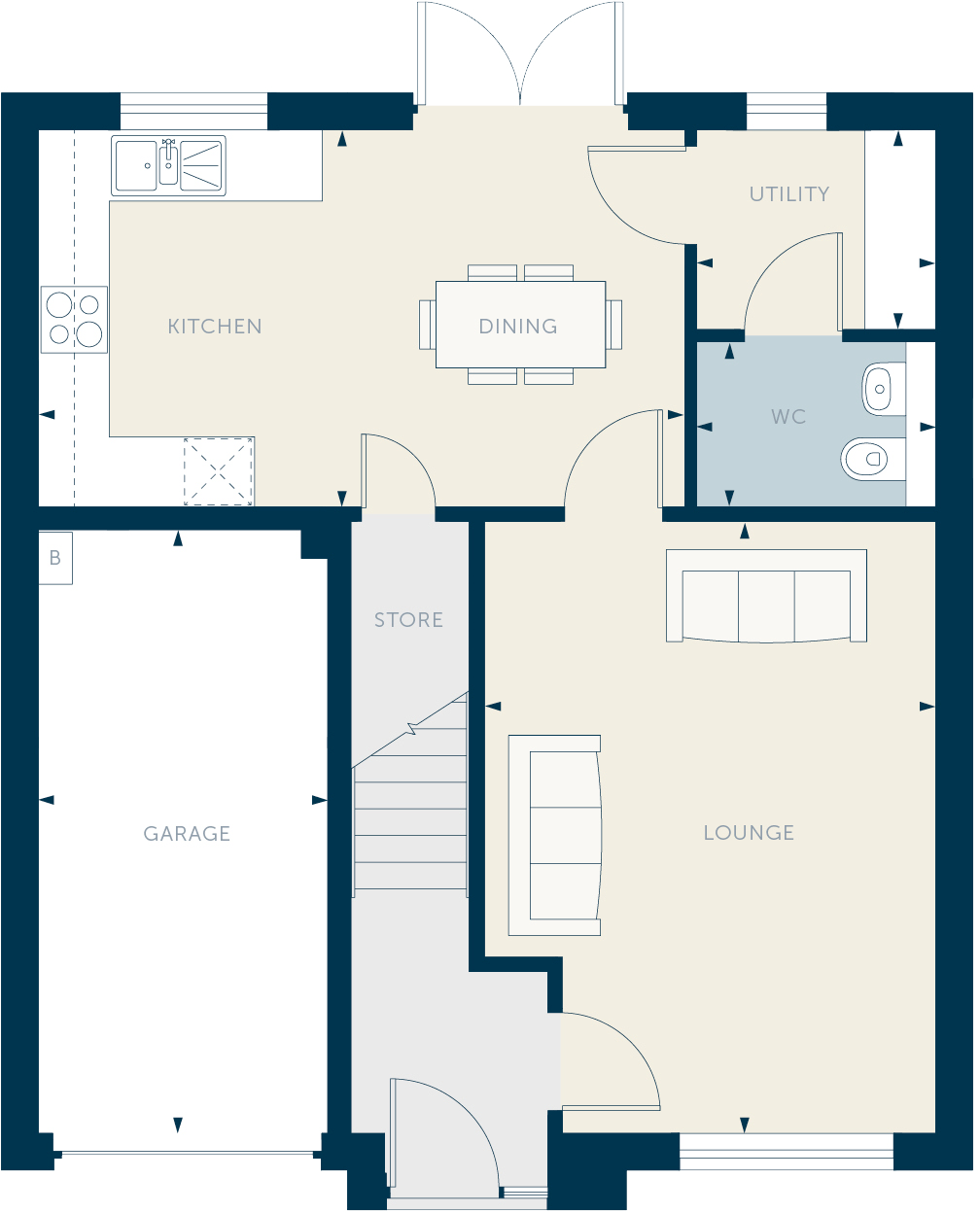 This generous family home with integrated garage has a welcoming hallway leading into a large lounge with deep windows, which bring in lots of light. The flexible, open plan kitchen/dining space extends the width of the home and has under stair storage, utility area and WC. Wide French doors lead in