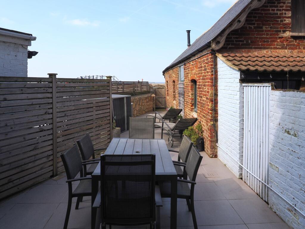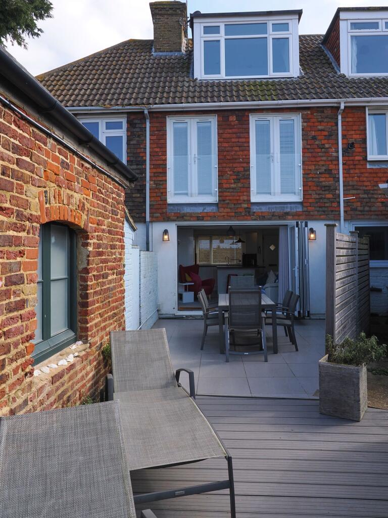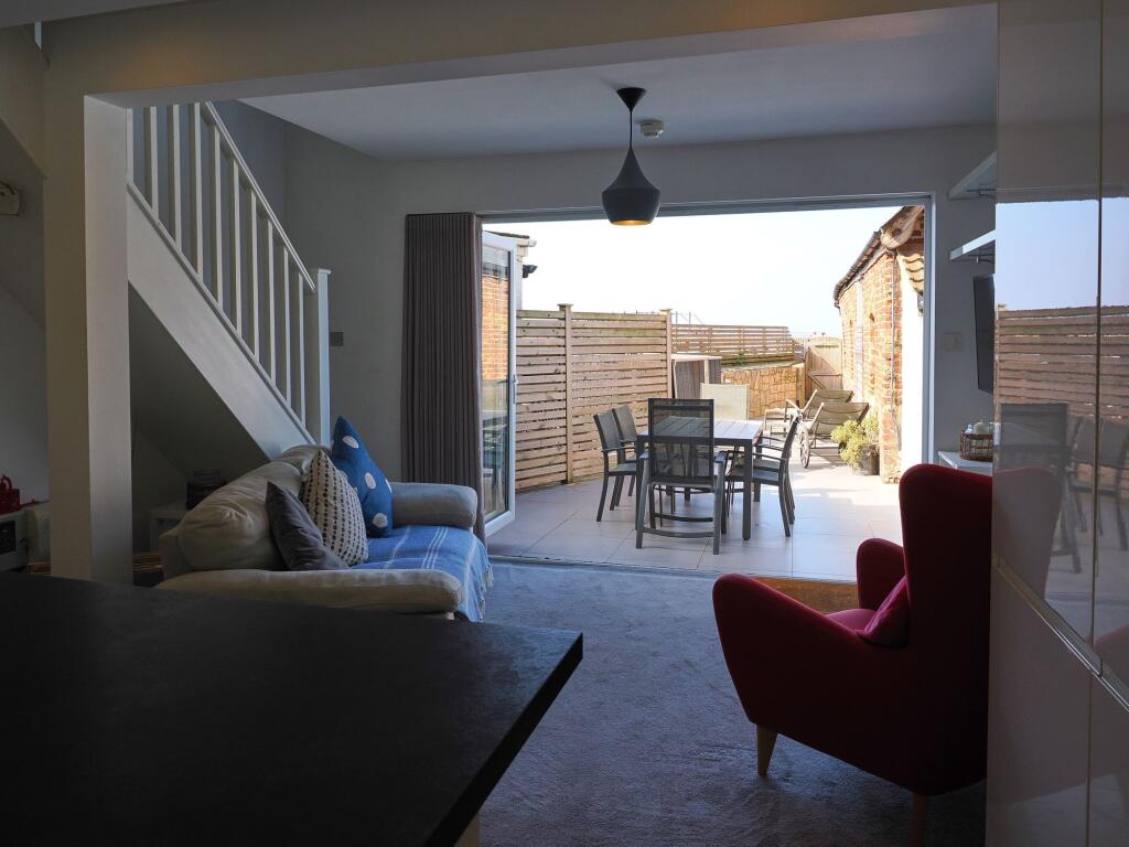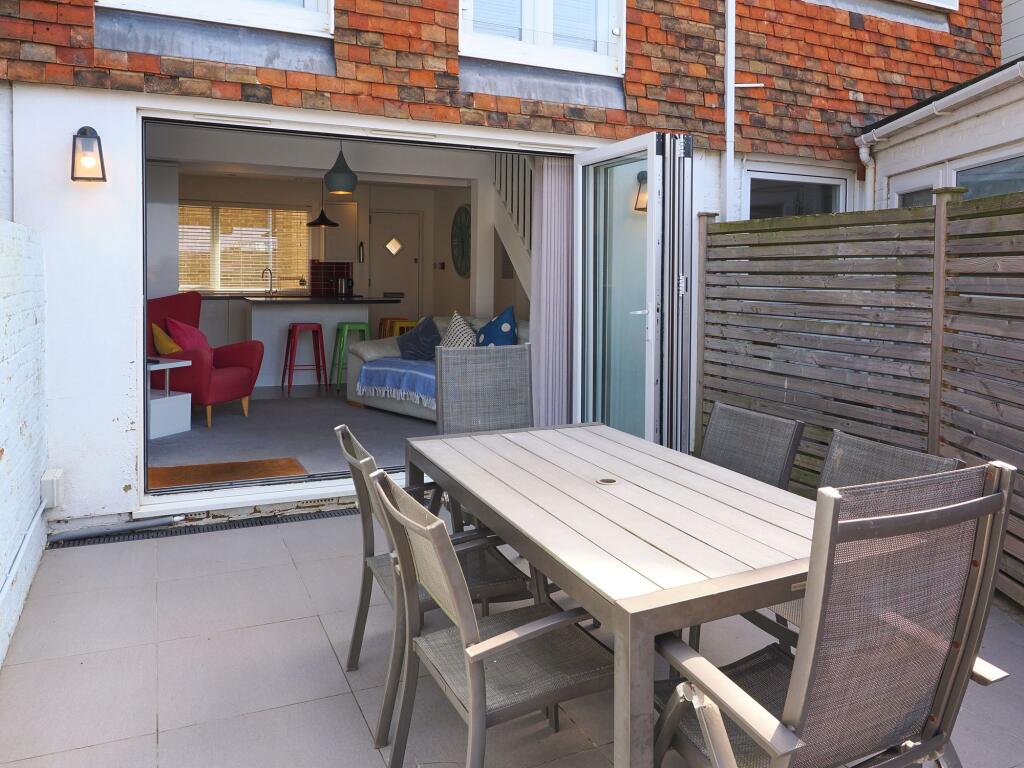 The property appears to be in excellent condition, having undergone some modernisation while retaining some traditional character. The interior is bright, modern and well-presented, with a contemporary kitchen and bathroom. The images show a well-maintained patio area, ideal for outdoor entertaining, adding to the overall appeal.
