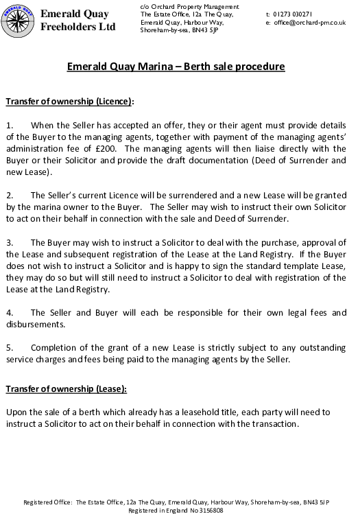 *** £16,000 *** BERTH 5, EMERALD QUAY. c/o Orchard Property Management The Estate Office, 12a The Quay, Emerald Quay, Harbour Way, Shoreham-by-sea, BN43 5JP Emerald Quay Freeholders Ltd Vessel size (max.) Berths 5-16 Length 35ft (10.67m) 26ft (7.92m)