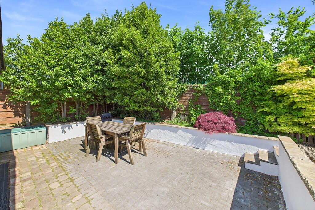 The property’s garden is a significant asset, offering ample outdoor space. The images show a well-maintained lawn and patio areas.