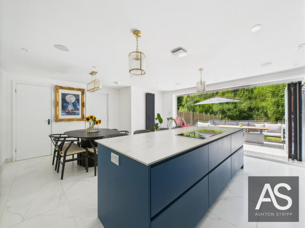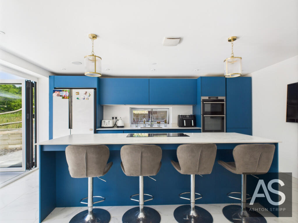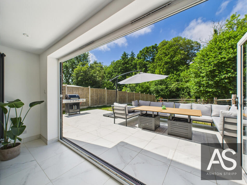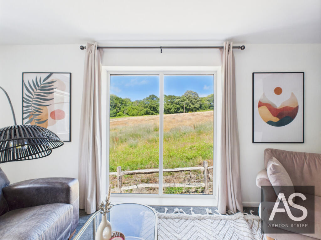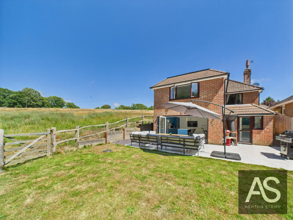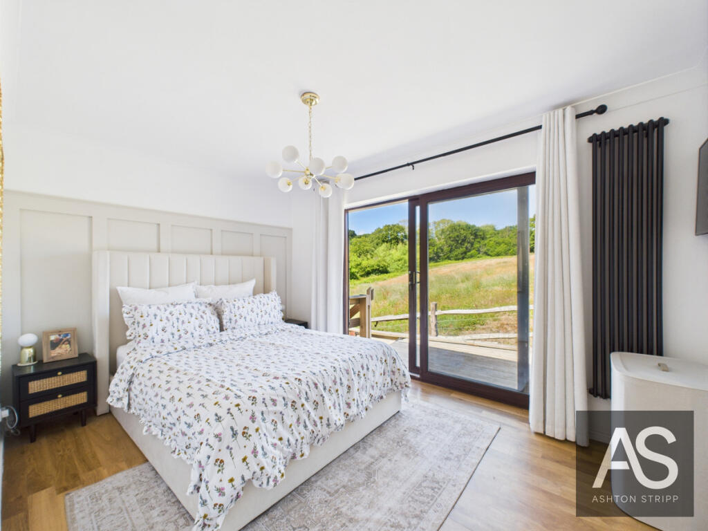 A stylish home offering open-plan living, bifold doors to the garden, four double bedrooms (two en suites), and views over fields. Features include a sleek kitchen, utility room, and main bedroom with decking. Perfect blend of indoor-outdoor living