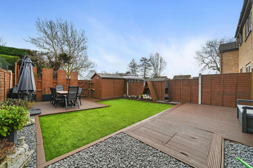 The property appears to be in good condition. The photos show a well-maintained interior and exterior. The kitchen and bathrooms seem modern and updated. The garden is well-landscaped with artificial turf and decking. There is also a shed in the garden.