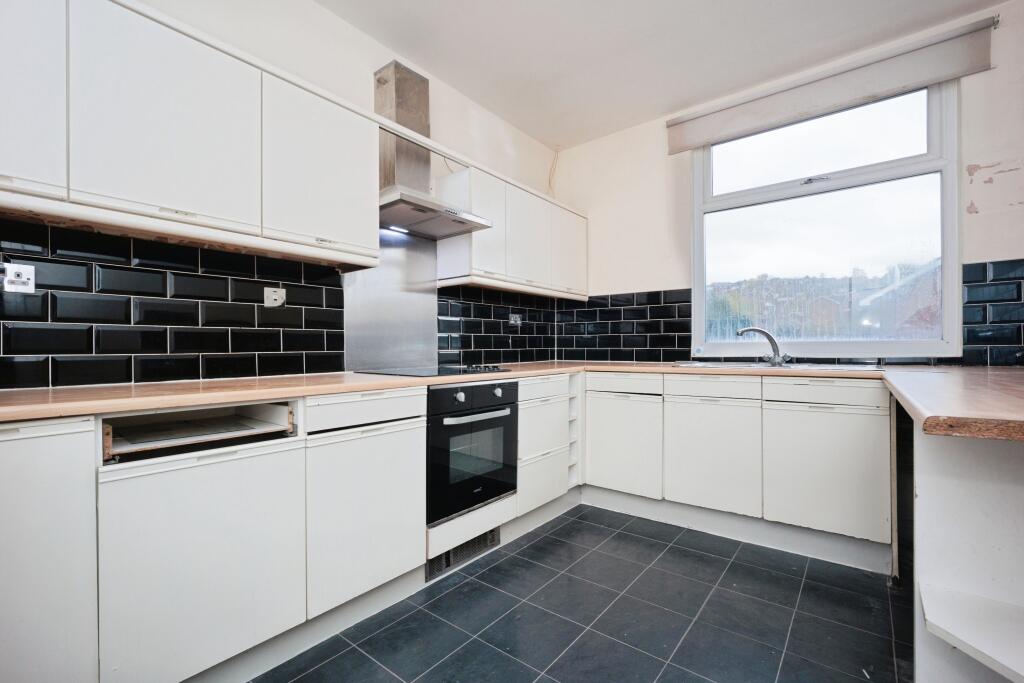 This is a two-bedroom flat on High Street in Stalybridge. The location is central, with good access to amenities, schools, and transportation. However, the property is in need of extensive renovation, as evidenced by the peeling paint, dated kitchen and bathroom. The asking price of £99,000 reflects the condition, presenting an opportunity for buyers willing to undertake the necessary work. There is no garden or land included.