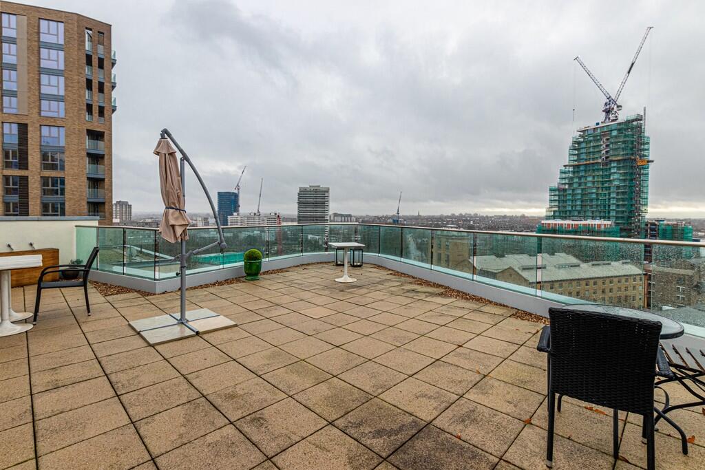 - Video Tour Available - Stunning two bedroom, two bathroom apartment on the 9th floor of Bridges Wharf SW11. The property comprises a fully fitted kitchen, plenty of storage, wood floors throughout and a large roof terrace with amazing river views. Approximately 1190 sq.ft