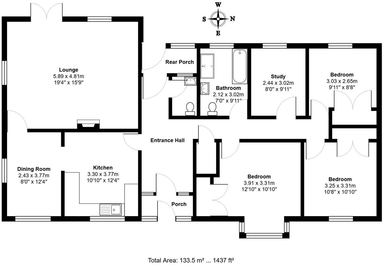 This detached bungalow in Bacton, Suffolk is listed at £350,000. The property has four bedrooms and one bathroom, and a total area of 1,143.42 sqft. The plot size is 1,437 sqft. The average price for properties in the area is £333,902, with an average size of 1,156 sqft and an average price per sqft of £288.