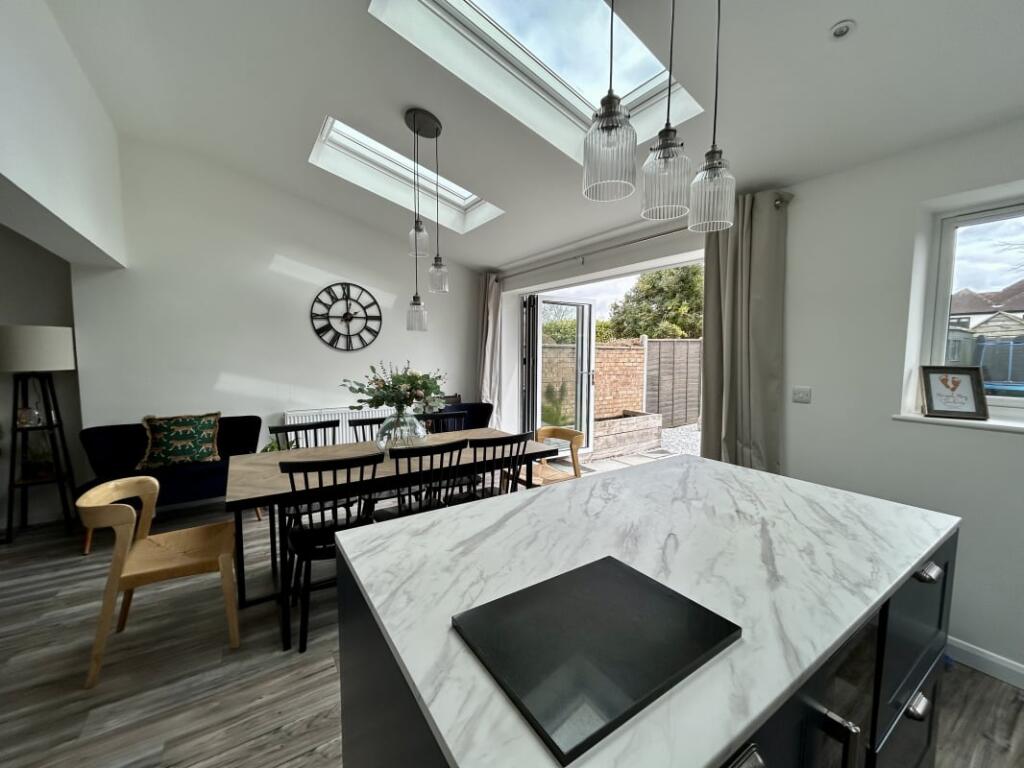 Deceptively spacious modernised family home with enclosed garden, driveway parking for three vehicles and integral garage. Spacious open plan kitchen diner leading to living room with three double bedrooms and four piece bathroom suite.