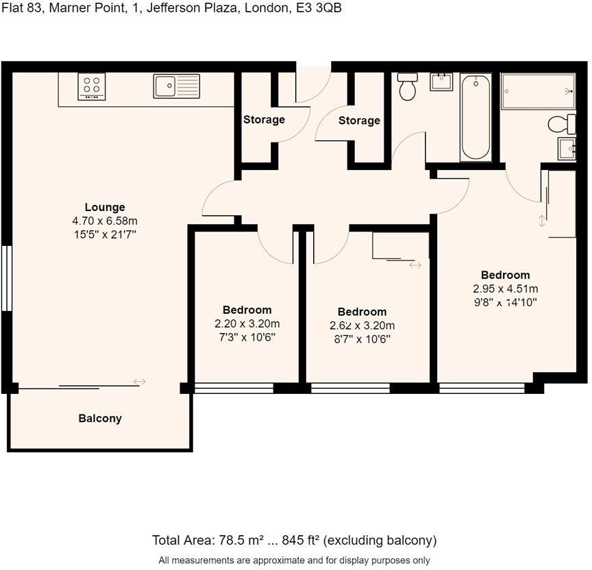 This is a 3-bedroom flat located in Jefferson Plaza, Bromley South, London. The property offers 2 bathrooms and has a total area of 844.97 sqft. The flat benefits from a balcony. Nearby schools include Ian Mikardo School and Marner Primary School. Several transportation options are available, with West Ham being the closest station at 1.97 KM away. The flat appears to be in good condition and offers modern living space. The asking price of £550,000 seems reasonable given the location, size, and condition of the property.