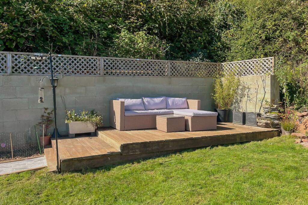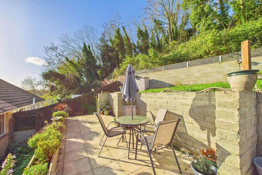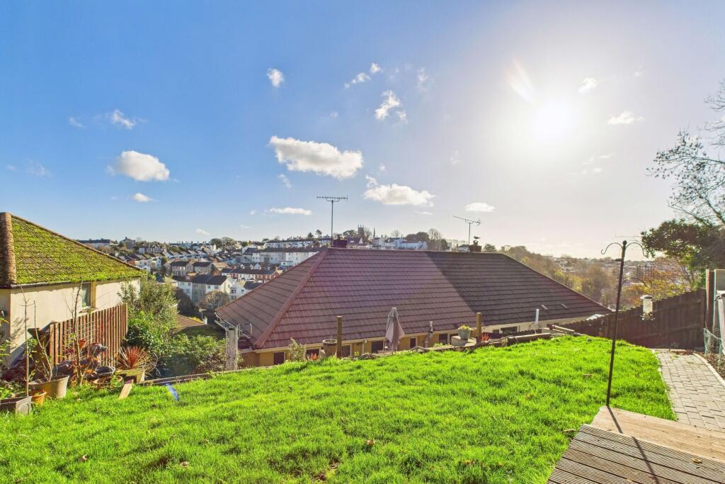 This is a two-bedroom semi-detached bungalow in Torquay. The property features a modern kitchen and bathroom, a multi-tiered garden with patio and decked areas, and off-street parking with a garage. While generally well-maintained, some areas like the laundry room appear unfinished. The location offers proximity to schools and transportation. The asking price of £260,000 is in line with similar properties in the area. The property is listed with Daniel Hobbin Estate Agents.