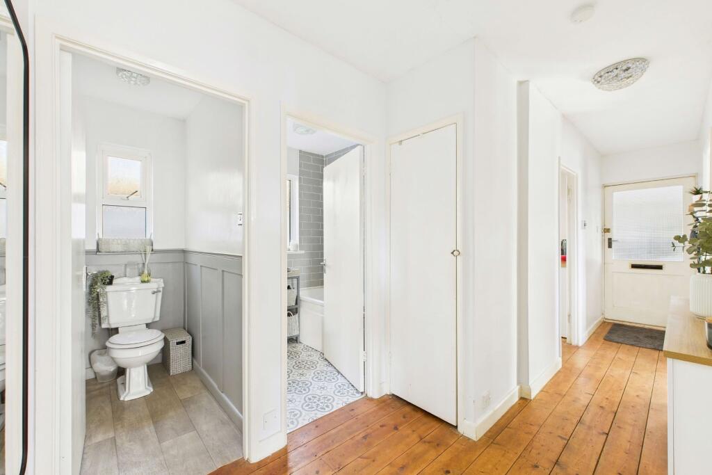 Chain-Free Semi-Detached Bungalow in Quiet Cul-De-Sac | Driveway Parking for 2 Vehicles & Garage | Spacious Porch with Units & Garden Access | Contemporary Kitchen | Under-House Utility & Storage Area | Living Room with Fireplace & Balcony | Multi-Level Rear Garden with Terrace & Lawn