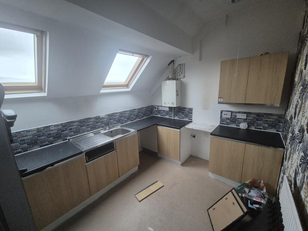 The property is a one-bedroom apartment located on Preston New Road in Blackburn. It is conveniently located near local amenities, schools, and transportation links. However, the property requires extensive renovation, as evidenced by the unfinished flooring, dated kitchen, and bathroom. The lack of a private garden may be a drawback for some buyers. Despite its condition, the property is listed at a very attractive price, significantly below the average price per square foot for the area, making it a potentially good investment opportunity for those willing to undertake the necessary work.