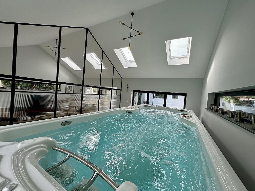This property, located in the charming Dorset village of Broadmayne, presents itself as a beautifully renovated and extended 5-bedroom home. The listing emphasizes a blend of rustic charm and modern architecture, a claim that appears supported by the provided images. The interior features an open-plan living area with high ceilings, large windows, and a sleek, contemporary kitchen and bathrooms. The extensive renovation is apparent in the high-quality finishes, including a standout indoor swimming pool. Outdoor space is a clear highlight: The property includes a well-designed garden that appears both functional and aesthetically pleasing. The addition of outbuildings like a shed and a charming shepherd’s hut suggests further amenity space.