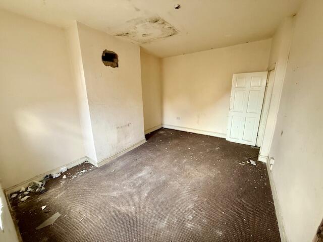 The property’s condition is poor, requiring extensive renovation. The images show significant damage and disrepair throughout, including damaged walls, ceilings, and flooring. The property appears to be stripped of fixtures and fittings, further highlighting the need for complete refurbishment. This will add substantially to the overall cost of ownership.