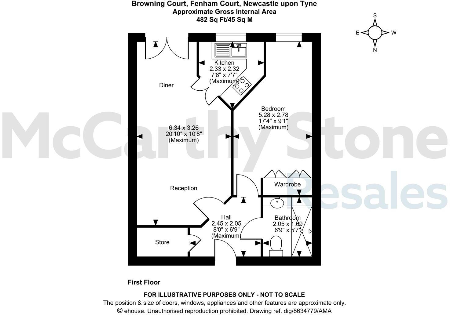 A one bedroom FIRST FLOOR apartment with SOUTHERLY FACING JULIET BALCONY overlooking the communal grounds in a quiet area of this McCARTHY STONE Retirement Living development located just 150 yards to a bus stop and 400 yards to local shops and amenities.