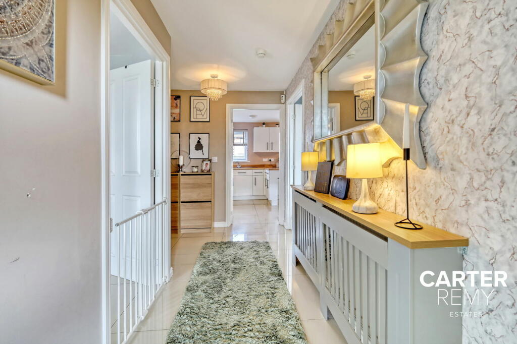 This 4-bedroom, 2-bathroom detached house in East Tilbury, Essex is presented in excellent condition, based on the high-quality images provided. The property boasts a modern interior design, well-maintained rooms and a clean, modern kitchen and bathrooms. The exterior shows a well-kept brick property with solar panels, suggesting energy efficiency. A notable feature is the garden, providing space for outdoor living.