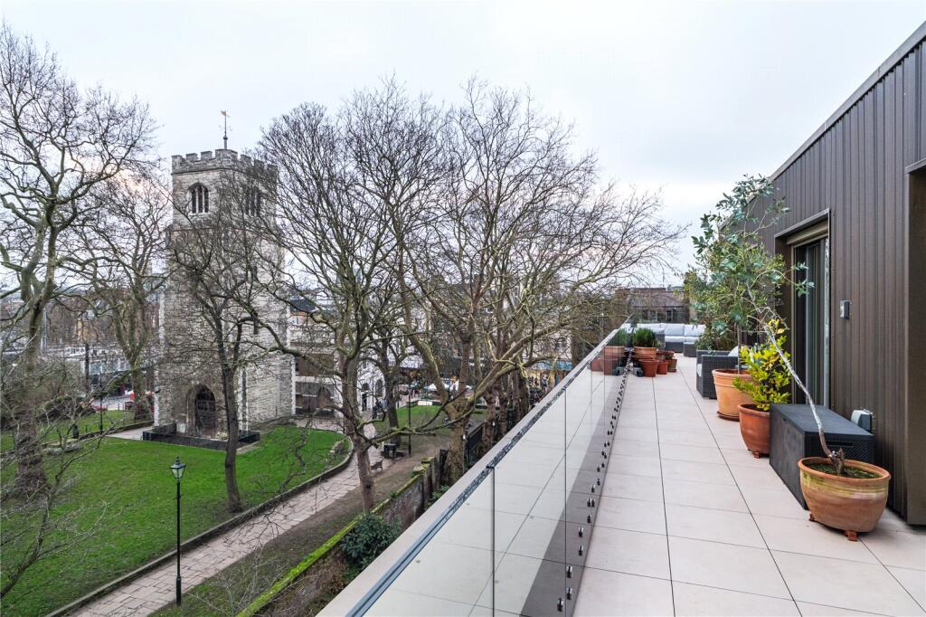 Securely set back and perched above the hustle and bustle of Mare Street, is this expansive, 1,275 sqft penthouse. With an extraordinary 850 sqft wrap around roof terrace, it is set within the grounds of Hackney St John Church gardens with enviable views of the Medieval Tower of St Augustine&rsqu...