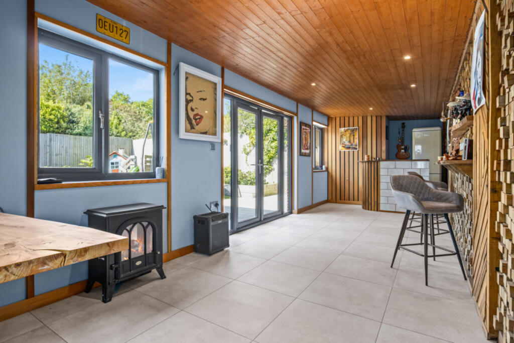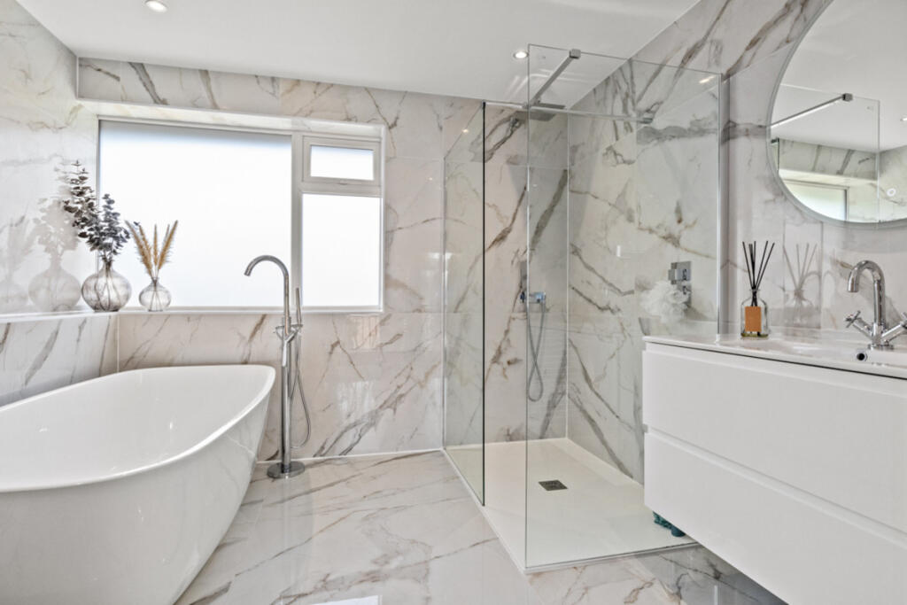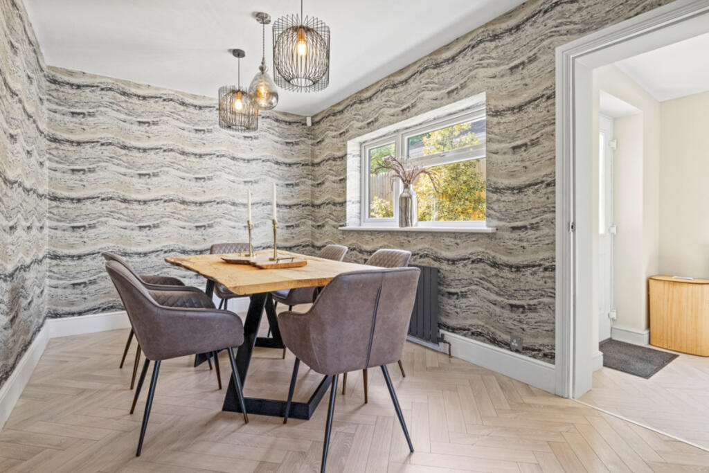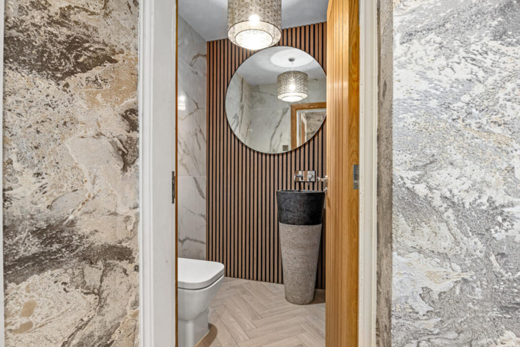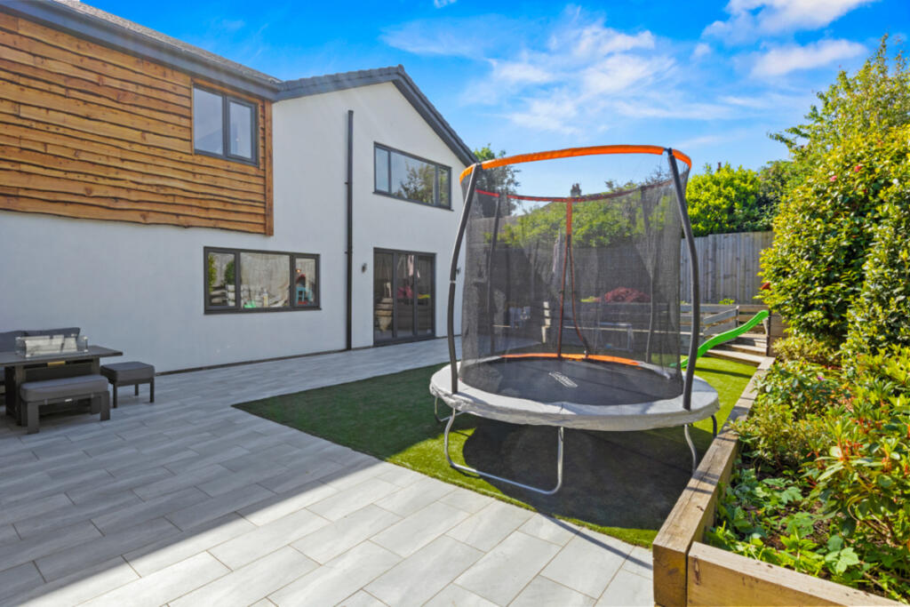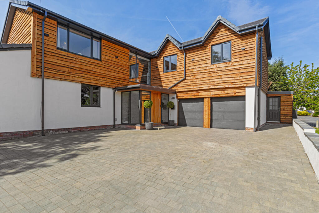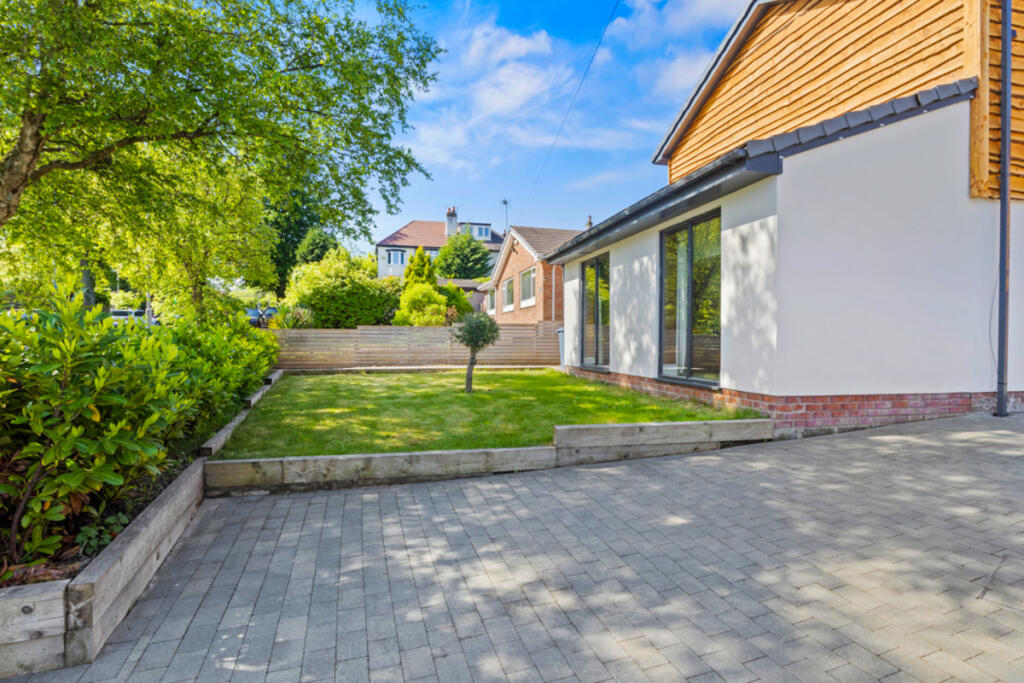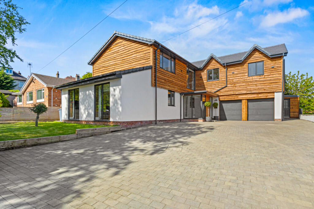Gateacre Park Drive is located in the Woolton area of Liverpool, Merseyside. The property is a detached house with four bedrooms and three bathrooms. Based on the images provided, the property appears to be in excellent condition, recently renovated to a high standard with modern fixtures and fittings throughout. The property benefits from a substantial garden with a paved patio area, ideal for outdoor entertaining. There is also a detached garage and ample off-street parking.