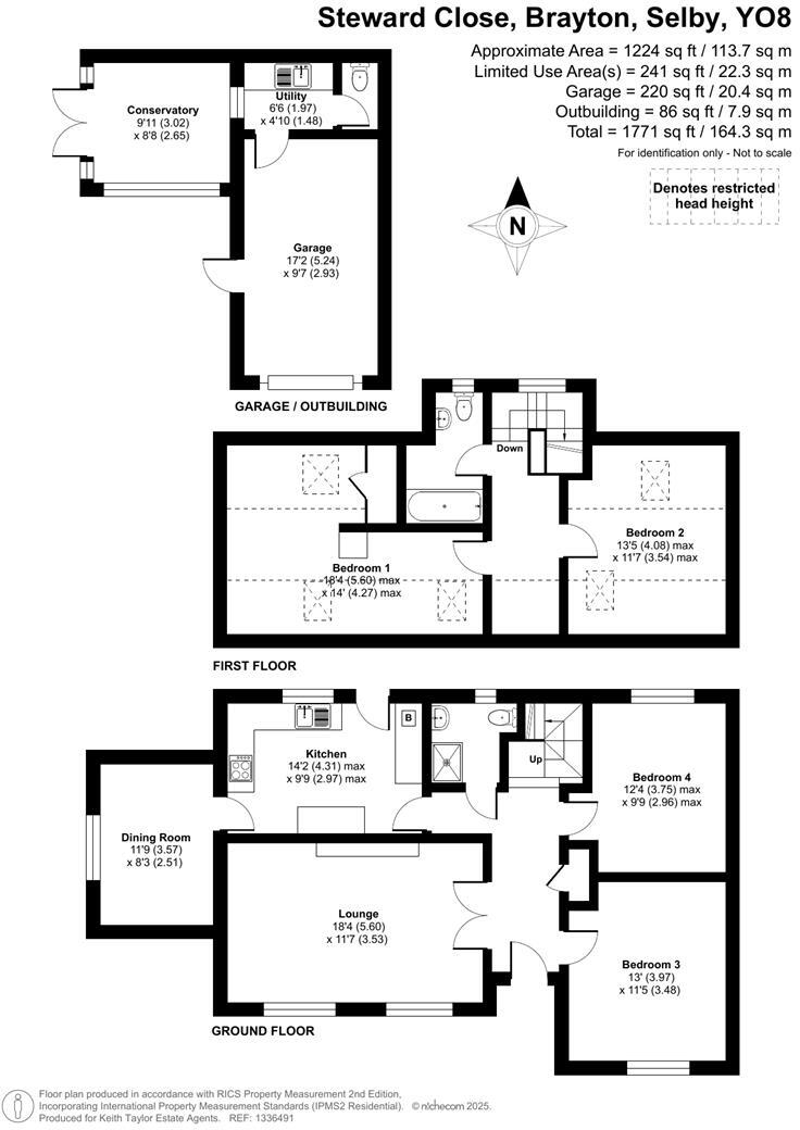 This is a detached bungalow located in Brayton, Selby, North Yorkshire. It features 4 bedrooms and 2 bathrooms, with a total square footage of 1,417.08. The property appears to be in good condition, with a modern kitchen and well-maintained bathrooms. The bungalow includes a garden. The location benefits from nearby schools and transport links.
