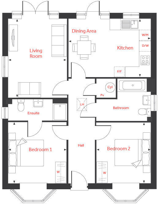 This charming property features 2-good sized bedrooms with bay windows at the front of the property and an open-plan kitchen-dining area at the back. Perfect for entertaining with family and friends. The Saxtead offers space, light and comfort, with the endless benefits of living on one floor.