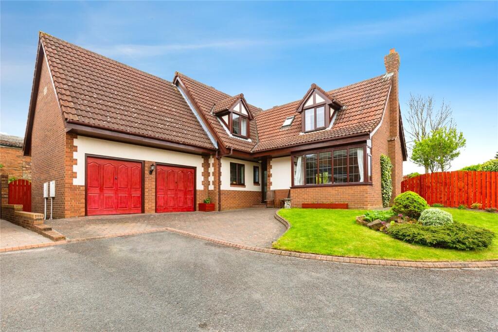 Set in a quiet cul-de-sac, this spacious detached home offers stunning south-facing views over the surrounding fields and towards Durham’s Cathedral skyline. With four double bedrooms, two en-suites, flexible living space, a double garage, and extensive landscaped gardens, it blends rural c...