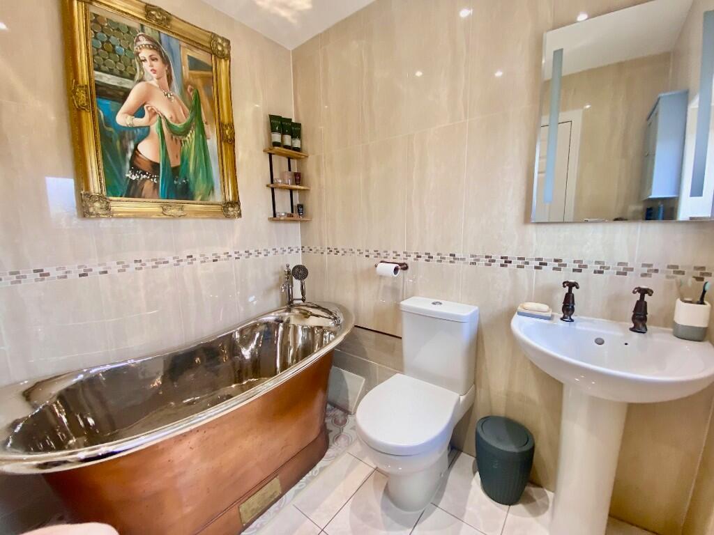 This is a detached property in Orton Brimbles, Peterborough. It features three bedrooms and two bathrooms. The property is in good condition and includes a garden, patio, and a garage. Nearby, there are schools and transportation links. The asking price is above the average for the area, but the condition and features of the property may justify the premium.