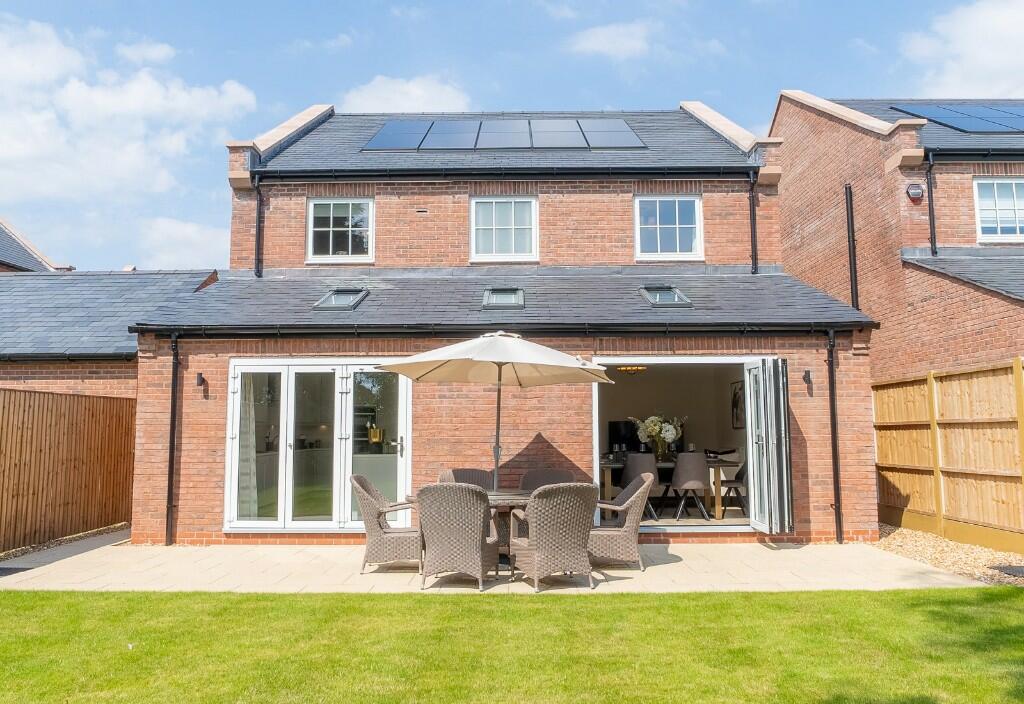 This property is a detached house located in Nether Alderley, a village near Alderley Edge in Cheshire. The area is known for its affluent residents and desirable location. Based on the images provided, the property appears to be newly built or recently renovated to a high standard. The interior is modern and well-presented, featuring a spacious kitchen, dining area, and multiple bedrooms and bathrooms. The exterior shows a well-maintained property with a garden.