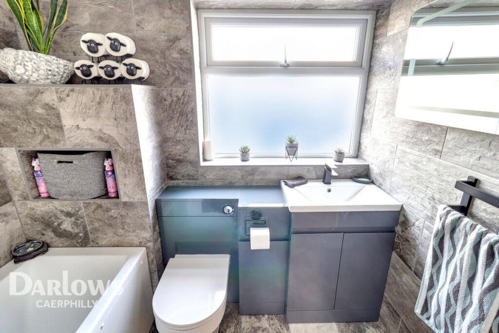 This is a well-presented semi-detached property in Hengoed, Caerphilly. The house features three bedrooms and two bathrooms, making it suitable for a small family. The interior appears to be modern and well-maintained, with a recently updated kitchen and bathrooms. The property benefits from a neatly landscaped garden, a garage, and off-street parking. While the price is slightly above the local average per square foot, the condition and additional features like the garage and modern interior contribute to its value. The location offers a balance between suburban living and accessibility to nearby towns and transportation links.