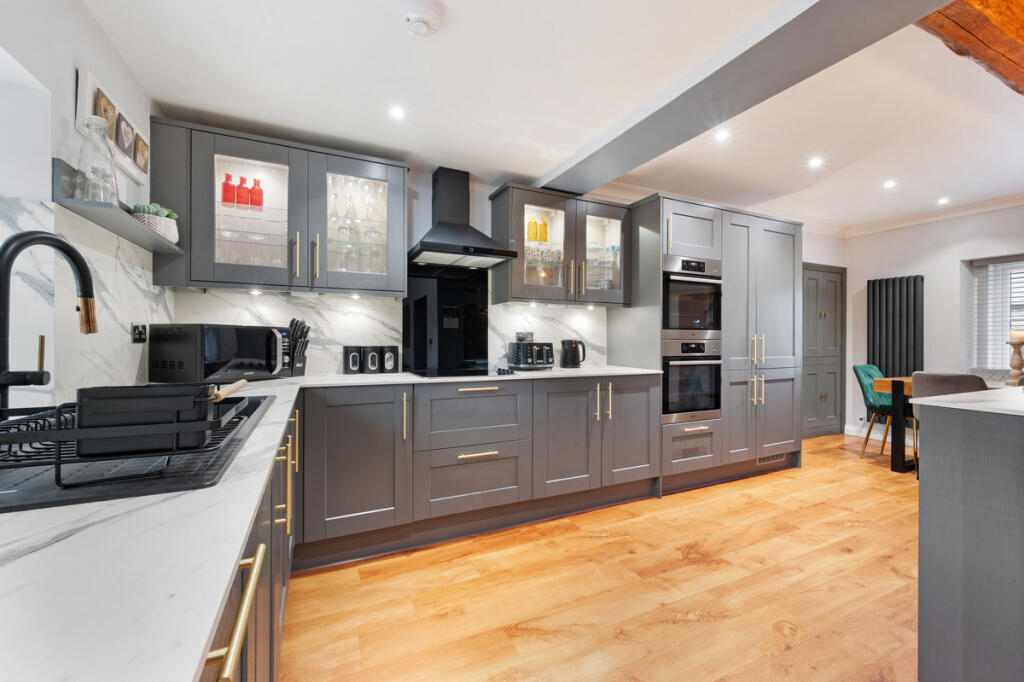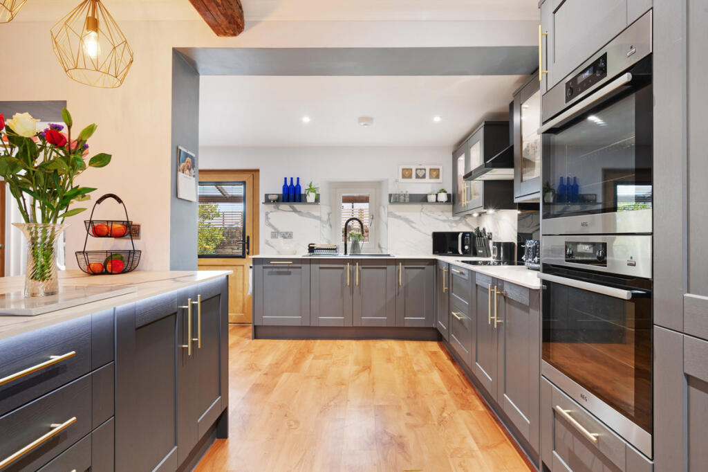The property appears to have been recently renovated to a high standard, with a modern kitchen and bathrooms. The interior is presented well, with modern furnishings and decor. The property also benefits from a garden, which includes a patio area, lawn, and a shed.