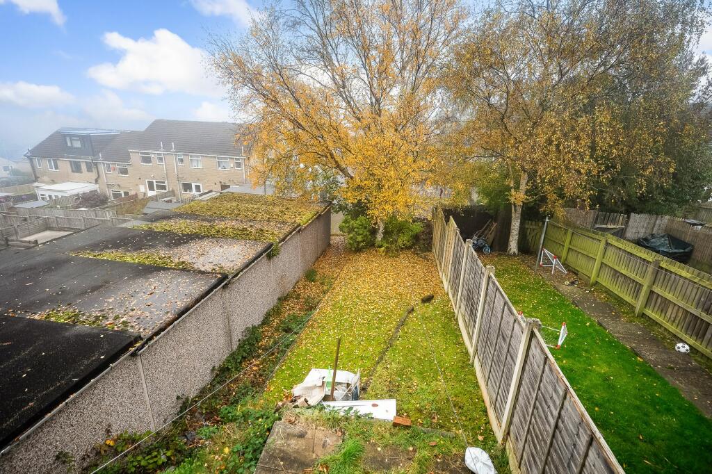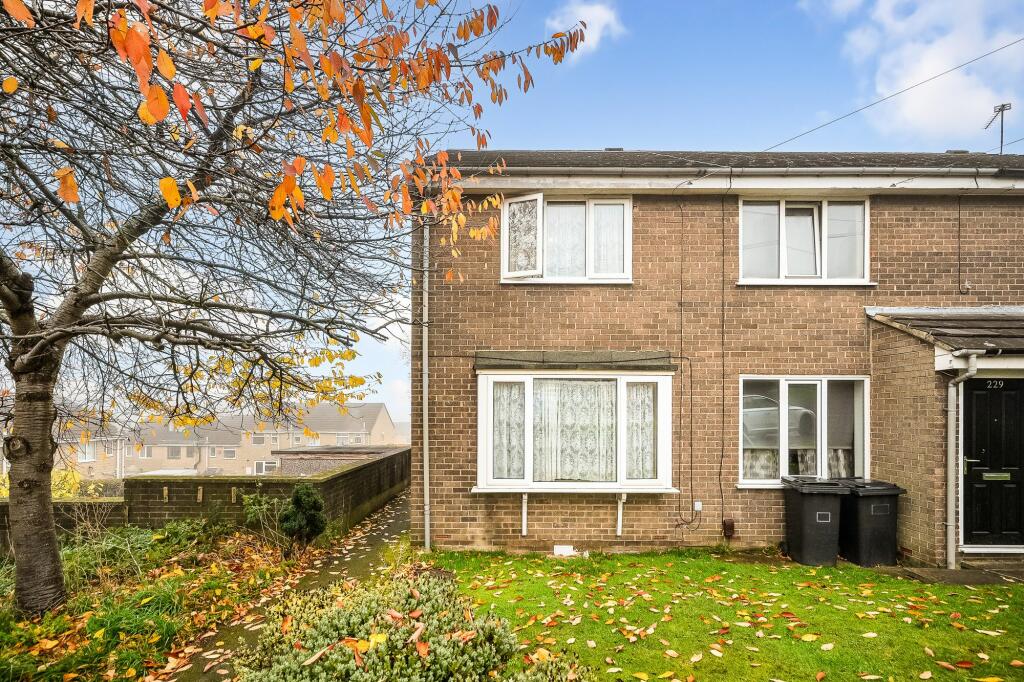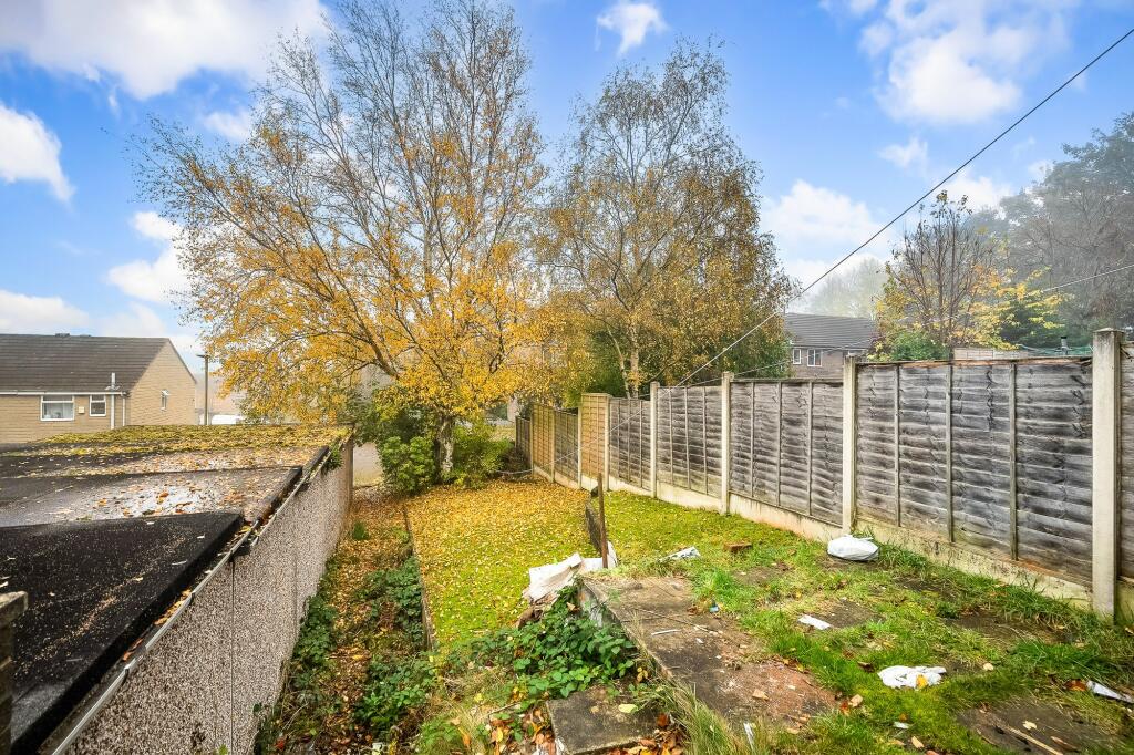 Ideal first-time buyer end townhouse from the 1970s with views of Grimescar woods. Features include living room, dining kitchen, two bedrooms, bathroom, front/rear gardens, single garage, gas heating, and double glazing. Great investment opportunity.