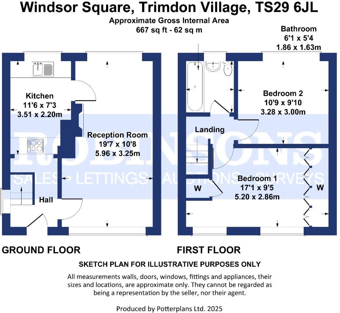 This is a two-bedroom semi-detached property located in Windsor Square, Trimdon Village. The property offers 537.77 sqft of living space and includes a garden. While the property has some modern updates, it could benefit from further modernisation, particularly in the kitchen and bathroom. The location is in a residential village with access to local schools and amenities. The asking price of £59,950 appears reasonable when compared to the average price per square foot in the area.