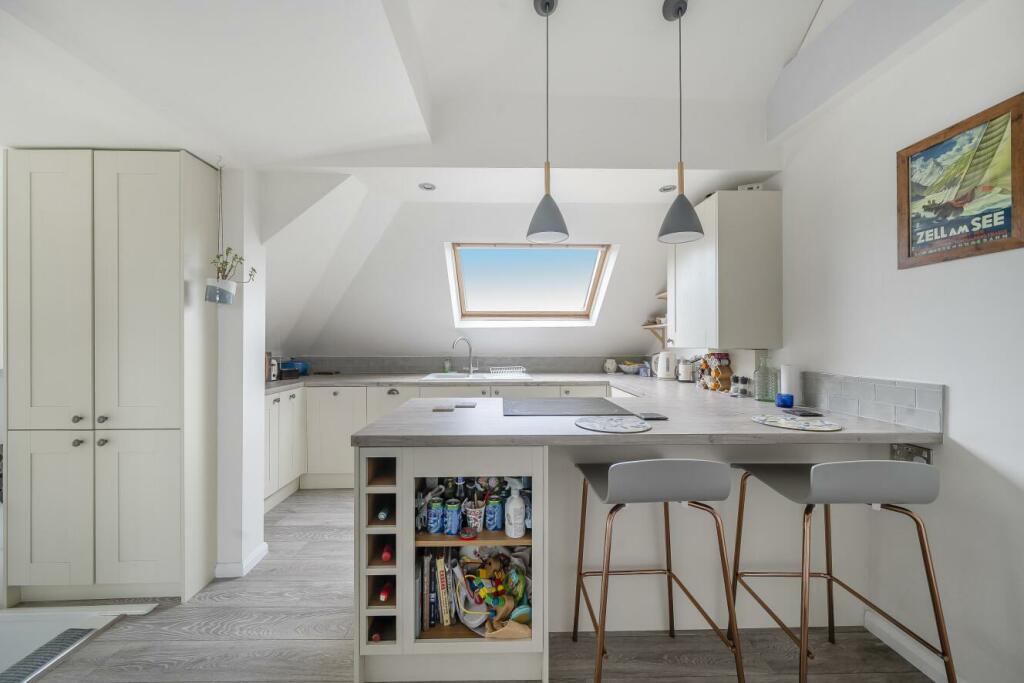 This two-bedroom, top-floor flat located on Minster Road, West Hampstead, is presented in good condition and benefits from a desirable location. The property has been evidently updated to a modern standard, as shown by the contemporary kitchen and bathroom finishes. The abundance of natural light via the numerous skylights is a positive feature, contributing to a bright and airy feel within the property. West Hampstead provides great transport links with nearby overground and thameslink stations making it well suited to commuters. The proximity to highly-rated schools like Hampstead School and West Hampstead Primary School are additional selling points for families. The lack of outdoor space and a relatively small plot size are notable drawbacks. While it is competitively priced for the area and the condition it lacks some of the high-end features that would push the price further. Overall, it presents a reasonable opportunity within the market, especially for first time buyers or young professionals looking for a well-maintained and convenient property in a desirable location.