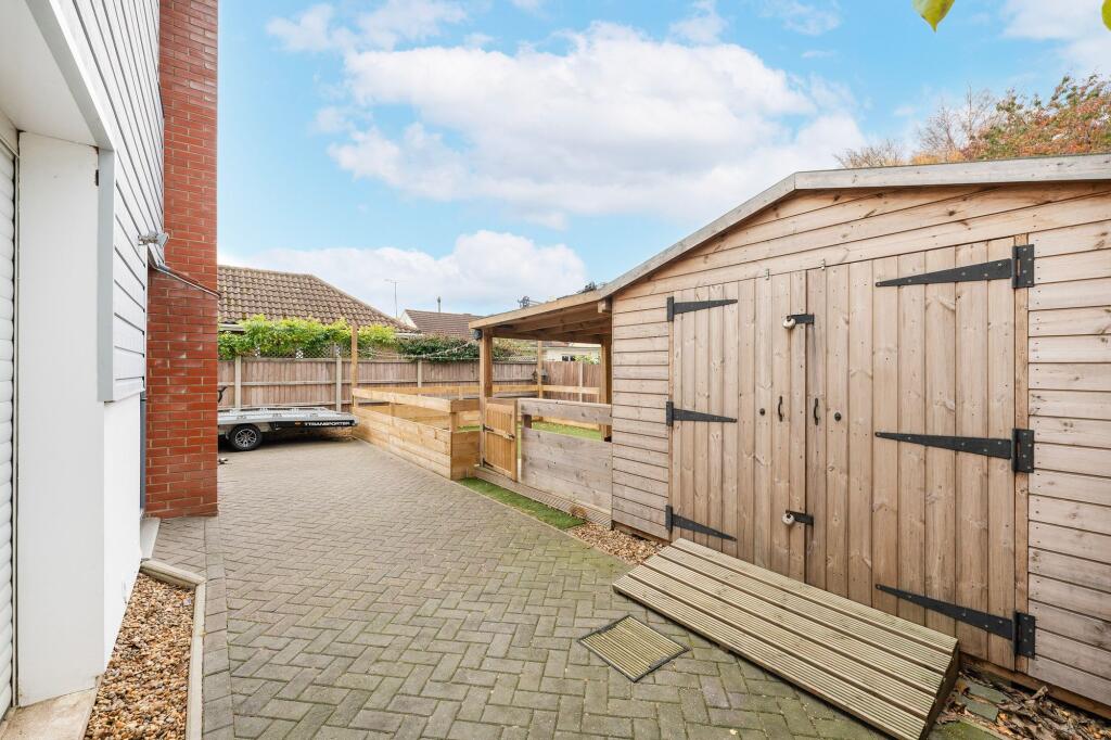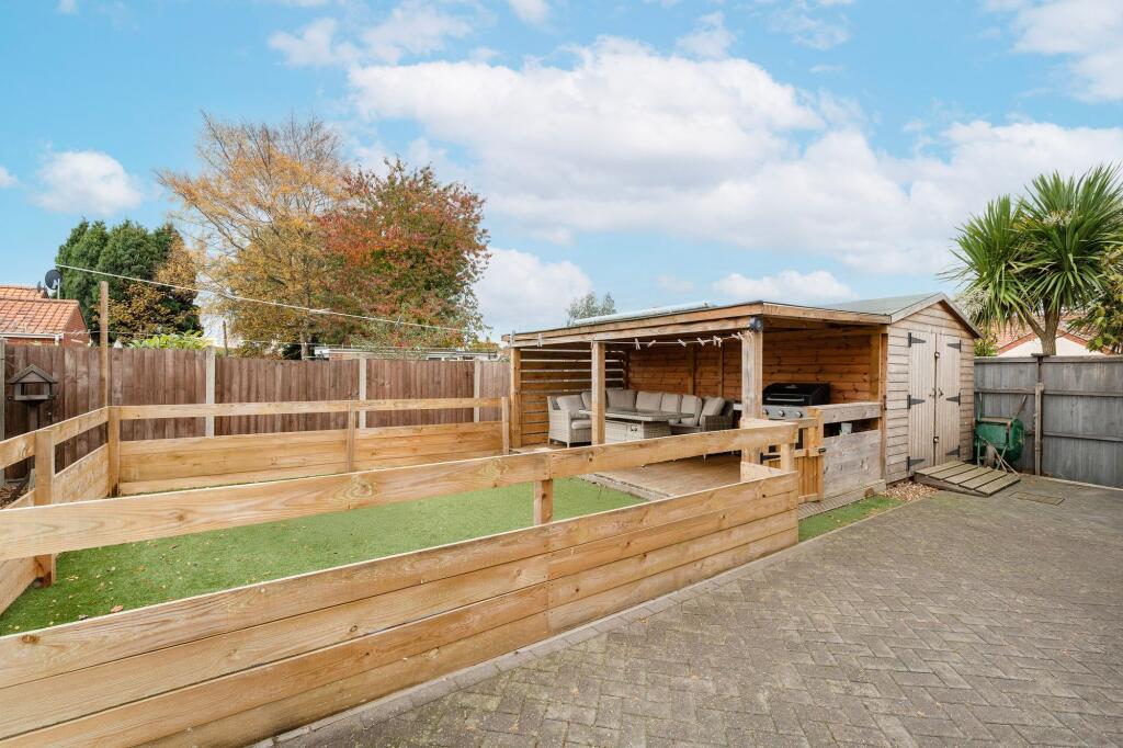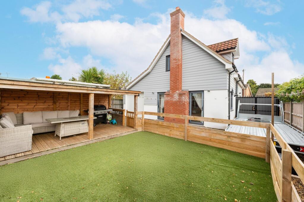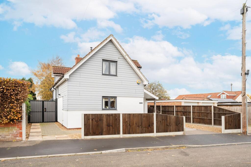 This is a 3-bedroom chalet in Hellesdon, Broadland, Norfolk. The property appears to be in good condition, with a modern interior and a well-maintained exterior. It features a garden with a shed and covered seating. The location is convenient, with nearby schools and transportation links. The asking price of £325,000 seems reasonable for the area and the property’s features. The property benefits from off street parking and a garage. The property is located close to local schooling.