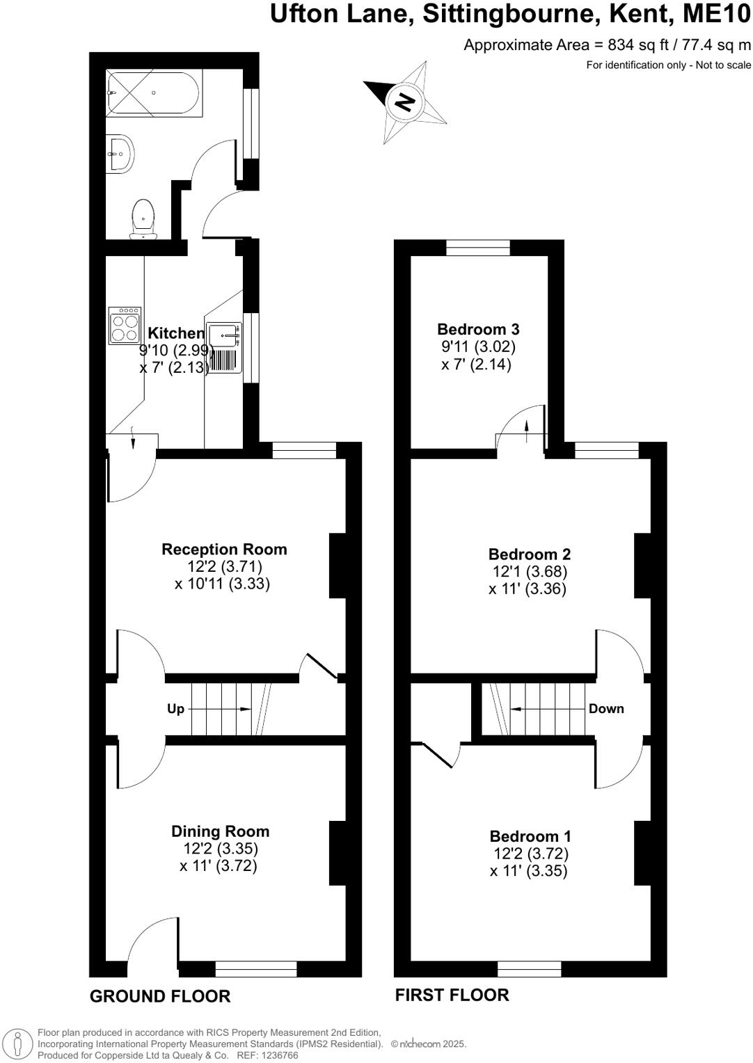 The property’s condition appears acceptable for its age, though some updating could be undertaken to enhance its appeal. The images show a functional layout; the kitchen and bathroom are fairly standard but could benefit from some modernisations. The garden is a bonus but requires some attention. The size of the property at 834 square feet is typical for a three bedroom home of this type.