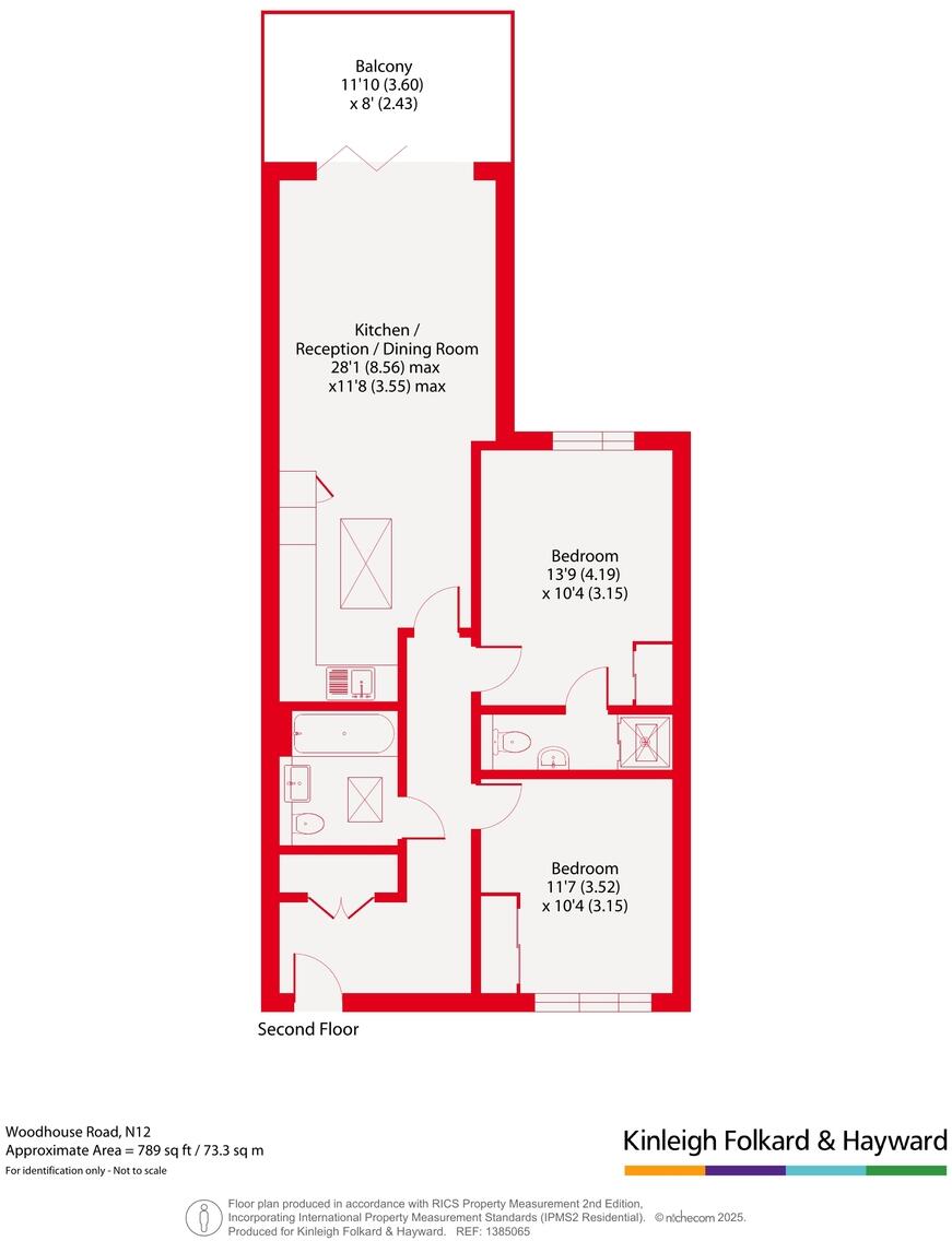 This is a modern flat in Woodhouse Road, Barnet, London. The property features two bedrooms and two bathrooms, with a square footage of 789. The flat benefits from a garden and a balcony. The property is in good condition, with modern fixtures and fittings. The location is convenient for families, with several well-regarded schools nearby. However, the price is relatively high for the area, at £785 per square foot, compared to the local average of £552.