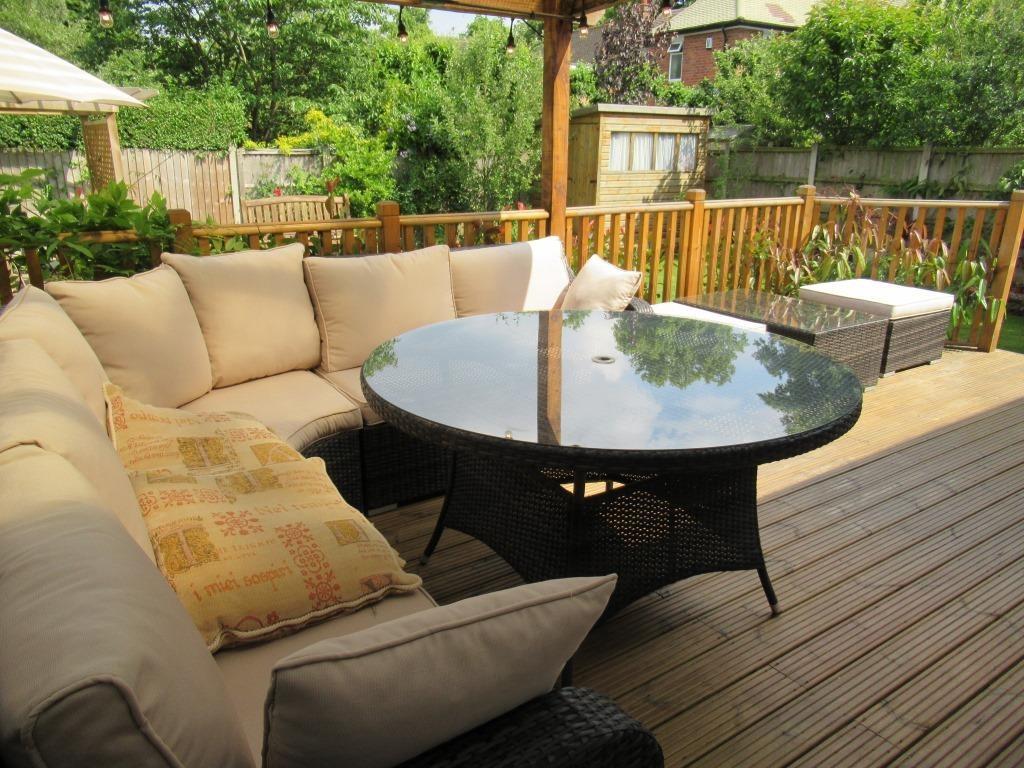The most striking feature of this property is its impressive garden. A sizable space is visible in the photographs, including both lawn and patio areas, a substantial decked area with multiple seating areas and pergolas. This outdoor space offers considerable potential for entertaining and relaxation, representing a valuable aspect of the property, particularly in a desirable location like Darley Abbey.