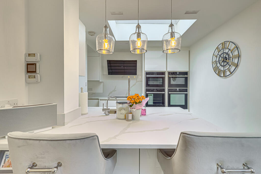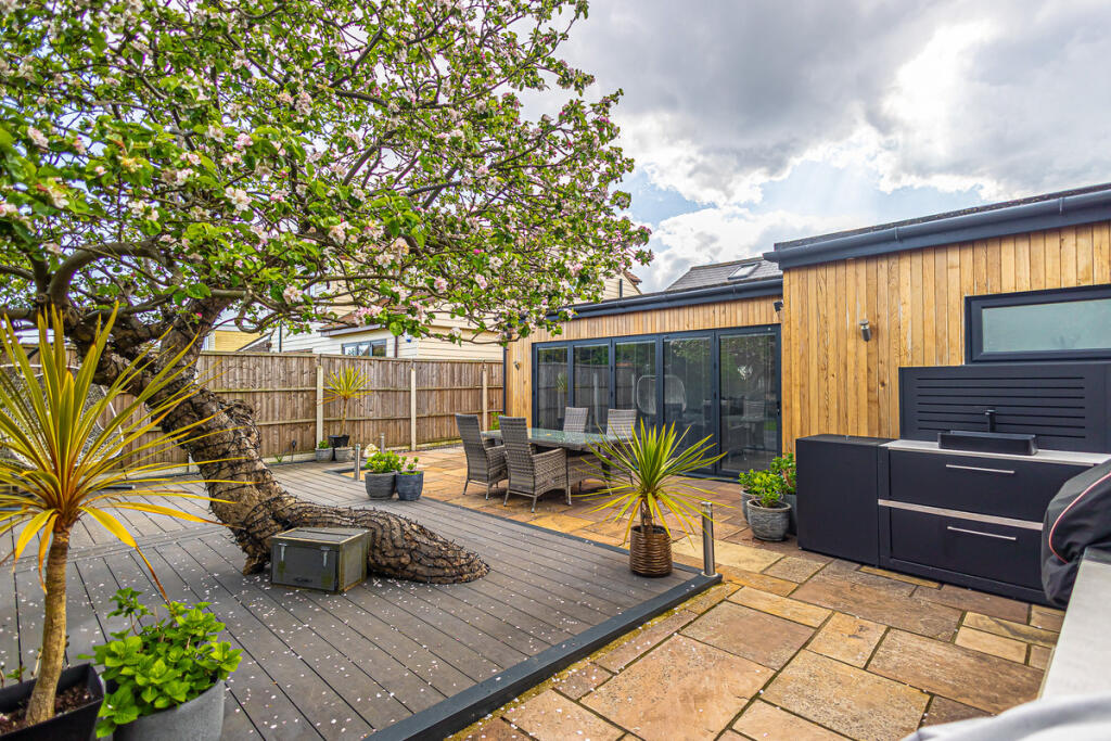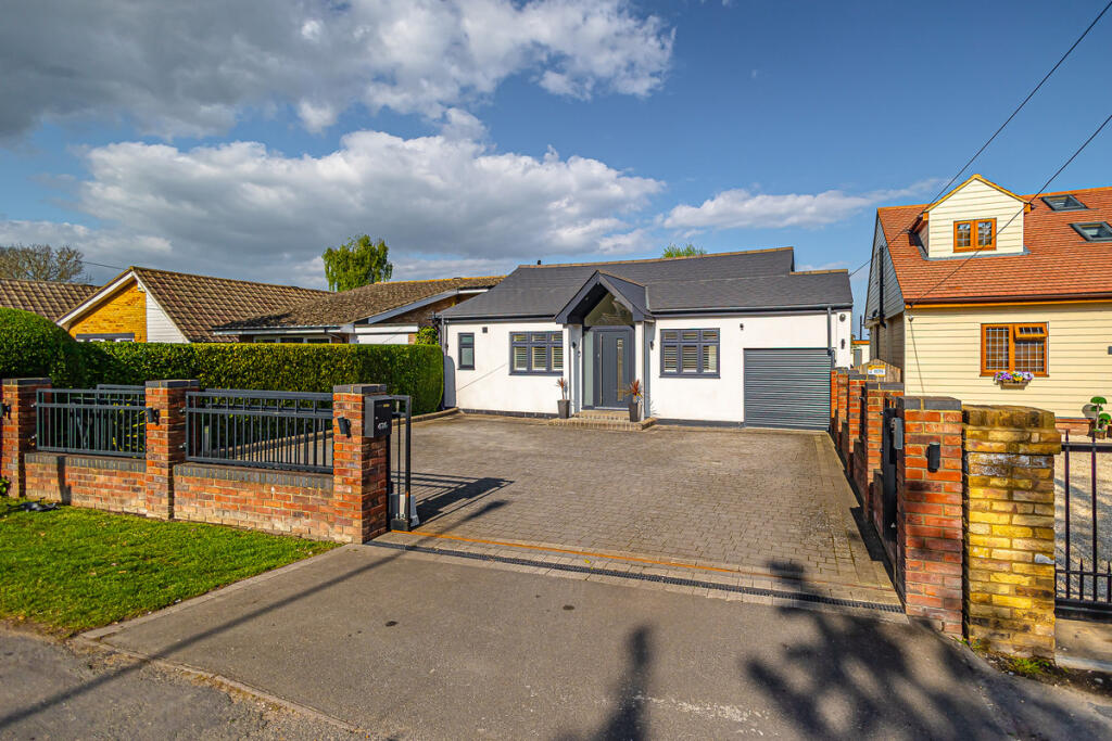 The property is a detached bungalow located on Ashingdon Road in Rochford, Essex. It boasts 3 bedrooms and 2 bathrooms, spanning 1,150 square feet. The asking price is £575,000. The location appears desirable, with relatively close proximity to several schools, including Holt Farm Infant and Junior Schools (rated ‘Good’ by Ofsted), and also within reasonable distance of train stations. The area also benefits from good transport links to Southend Airport. The images reveal a property that is in excellent condition. It has undergone a significant modernisation, featuring a contemporary kitchen and bathroom, and an extended living area. The property appears well-maintained and updated. The property includes a substantial garden with a patio area and a detached garden building. The size of the plot is not specified, however, the photos clearly show a significant amount of land for a bungalow in this area. Considering the average house price in the area is £474,359 and the average price per square foot is £428, the asking price of £575,000 for this 1,150 sq ft property appears slightly above average but justifiable given its excellent condition, the substantial garden, and the modern upgrades throughout.