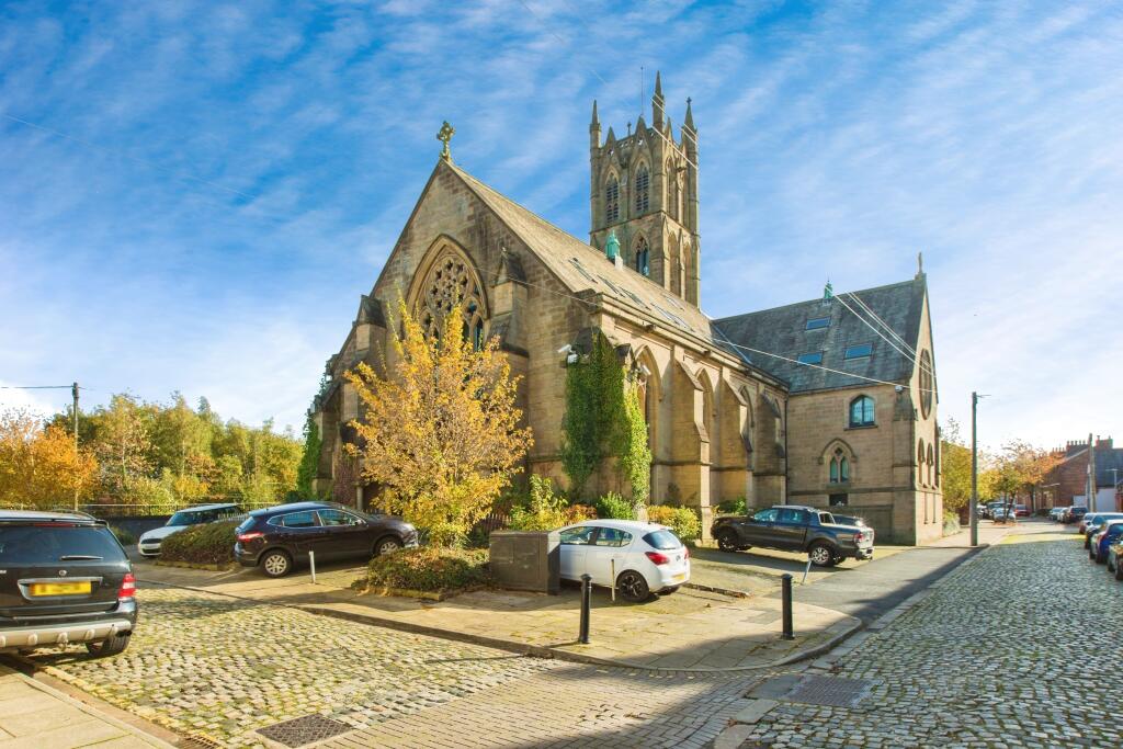 This one-bedroom flat in Preston city centre is located within a converted church. The property boasts a unique character with exposed wooden beams and high ceilings. The photos reveal a functional layout, including an open-plan living area, a modest-sized bathroom and one bedroom. The kitchen features light wood cabinets and a fairly basic set up. The flooring is consistent throughout and appears to be wooden.