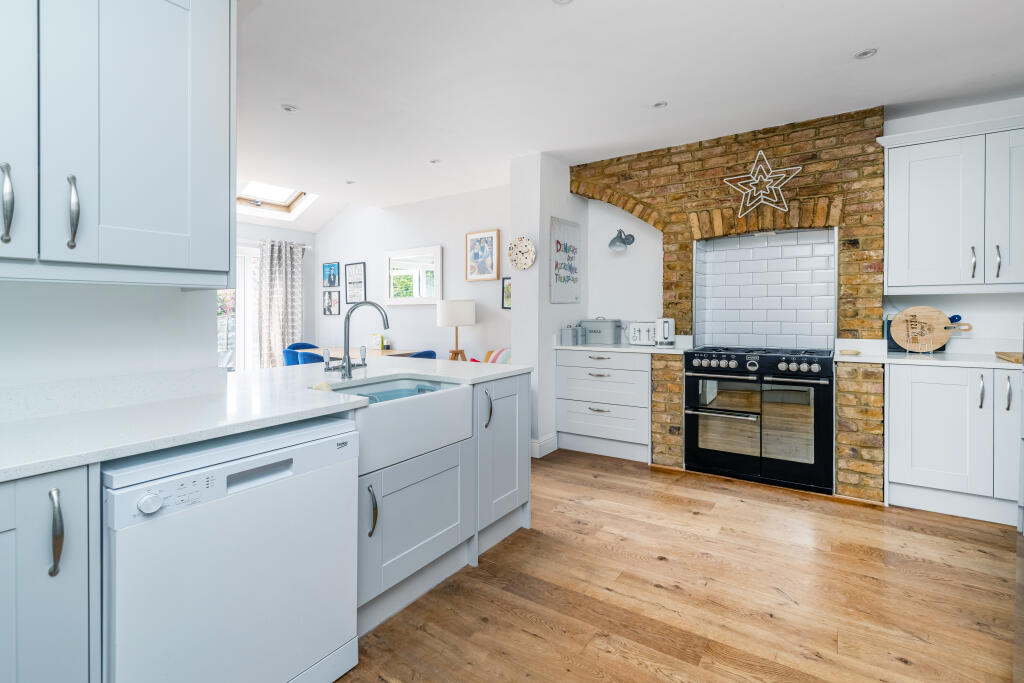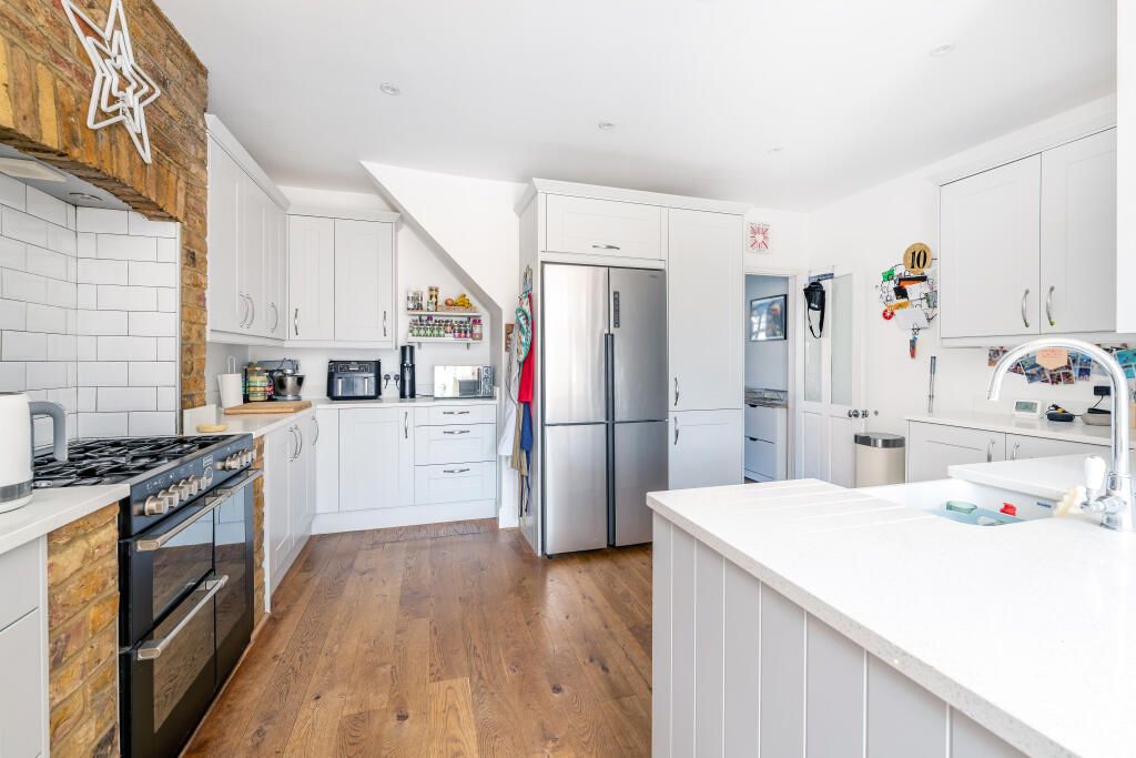 This is a three-bedroom terraced house on French Street, Lower Sunbury. The property appears to be in good condition, with a modern kitchen and bathroom. It has a garden with both lawn and gravelled areas. The property is located in a residential area with access to nearby schools and transportation. The list price is £650,000, which is reasonable for the area and the size of the property.