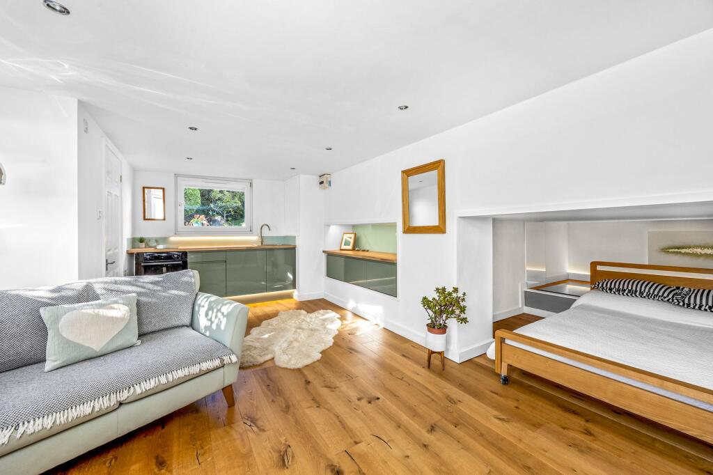 This modern studio annexe has been tastefully finished and has it’s own secure, gated access.The main living area has wood flooring and storage area with mood lighting for the bed, which can be pulled out when in use and pushed back when not in use to give more living space.