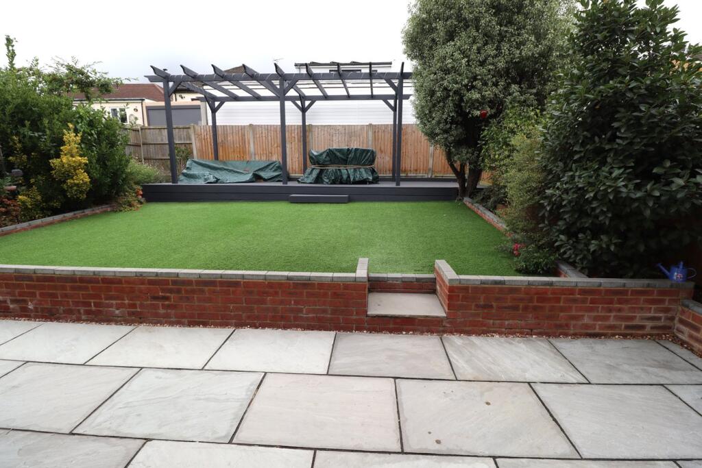 The property includes a substantial garden area, featuring a paved patio, artificial lawn, and a pergola. The size of the plot (1,582 sqft) is considerably larger than the average for the area, indicating a generous amount of outdoor space.