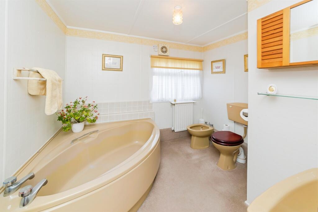 The park home itself appears well-maintained, though the interior design is dated. The kitchen and bathroom fixtures are visibly older, and an overall refresh may enhance the property’s appeal. The property includes a paved patio area and a small garden, providing some outdoor space.