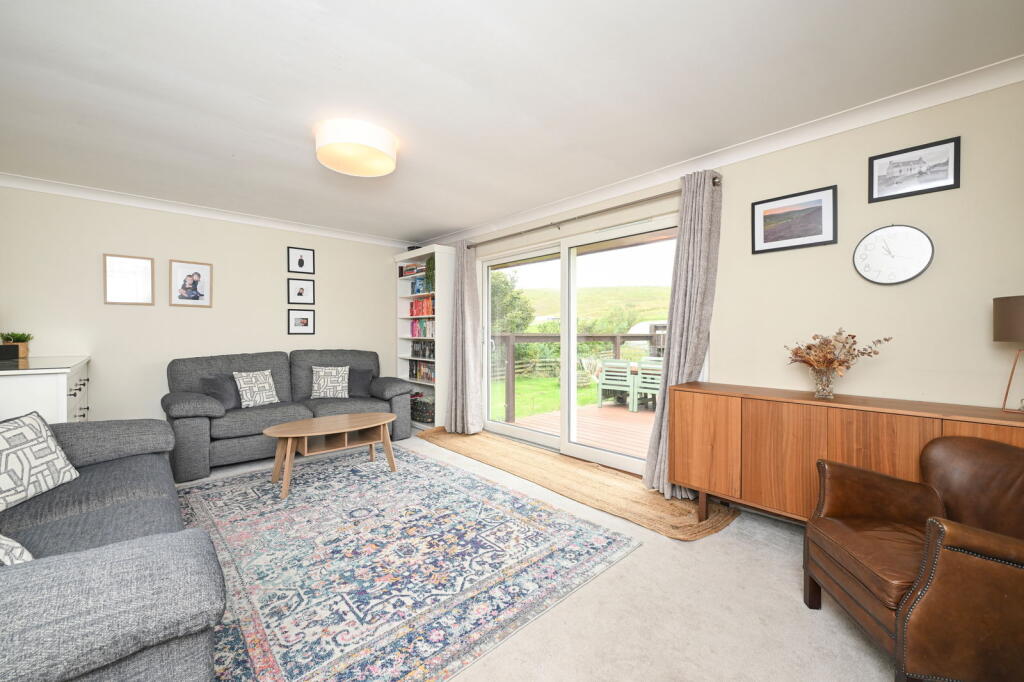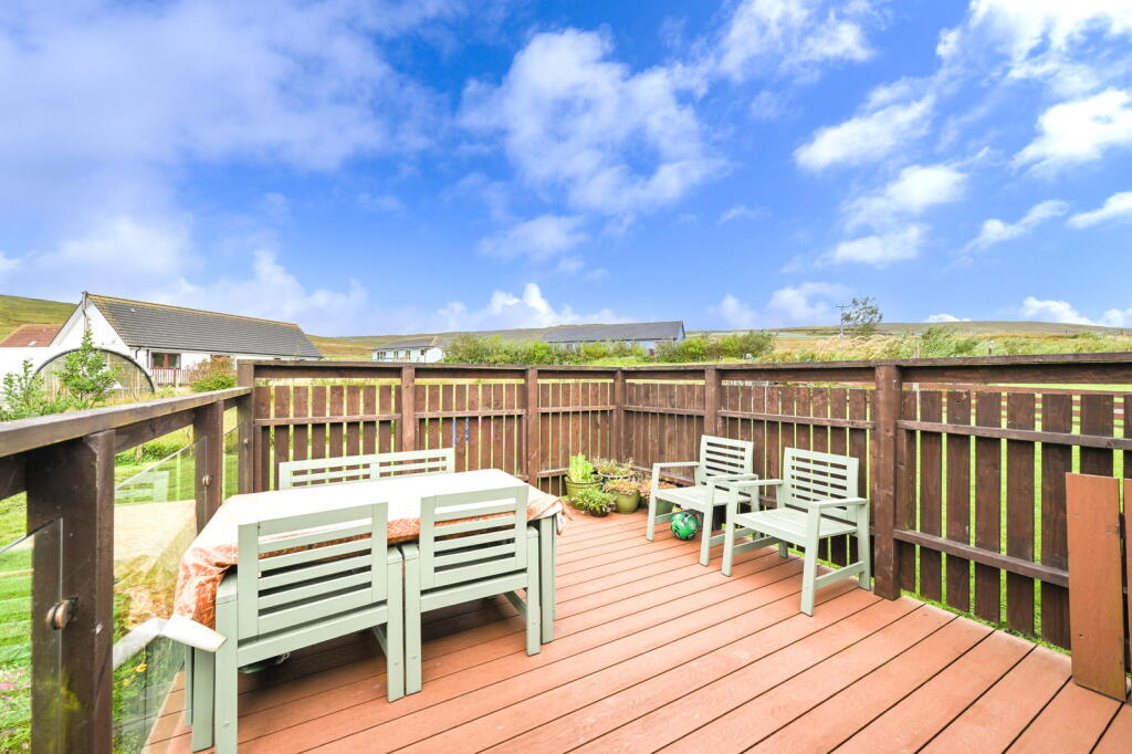 The property is a detached bungalow located in Sandwick, Shetland. It features 3 bedrooms and 2 bathrooms, with a total living space of 968 sqft. The property also benefits from a garden and a deck.