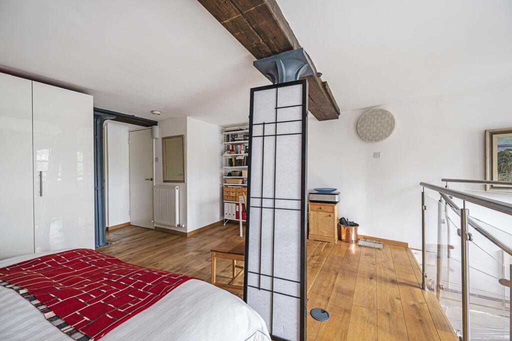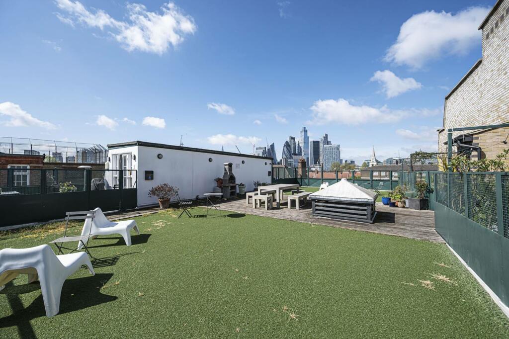 This one-bedroom, one-bathroom duplex flat located in the fashionable Spitalfields area of East London is presented in a well-maintained condition, though it does not completely shine in terms of modernization. The apartment features original architectural elements such as exposed brickwork and wooden beams, which lend a unique character to the space, creating a rather attractive and appealing living environment. The layout includes an open-plan living area with a well-equipped kitchen and a mezzanine level bedroom. Furthermore, residents benefit from access to a communal rooftop terrace that offers city views - adding to the overall attractiveness of the property.