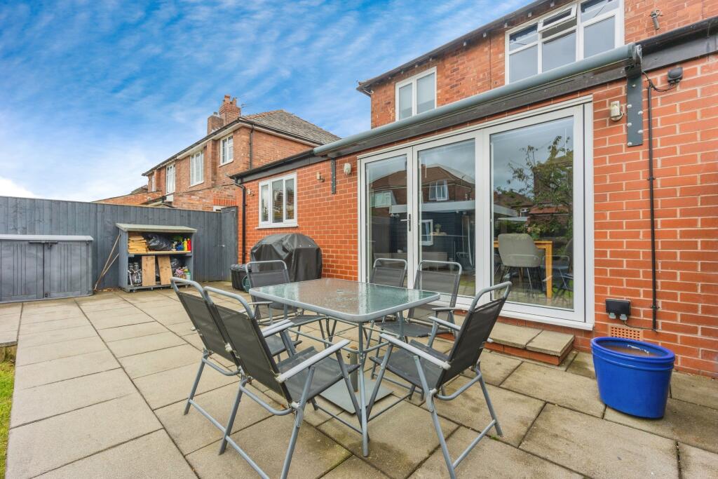 This is a three-bedroom semi-detached property located in Offerton, Stockport. The property appears to be in good condition, with a modern kitchen and bathroom. It benefits from a garden with a patio area and a shed. The property is located within a reasonable distance of schools and transportation links. The listing price is higher than the average for similar properties in the area.