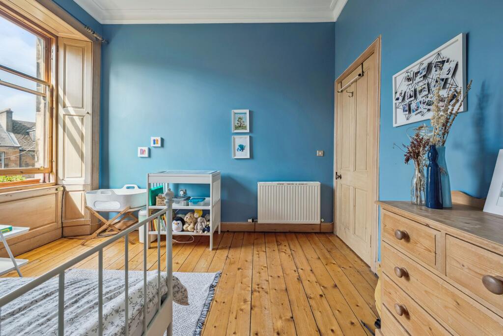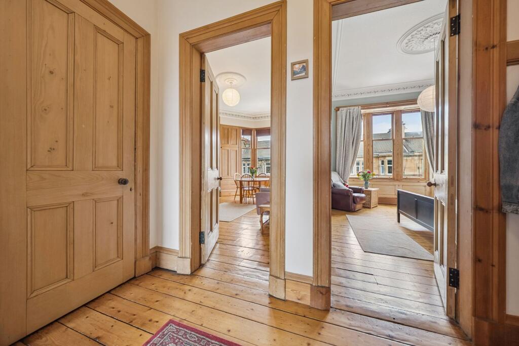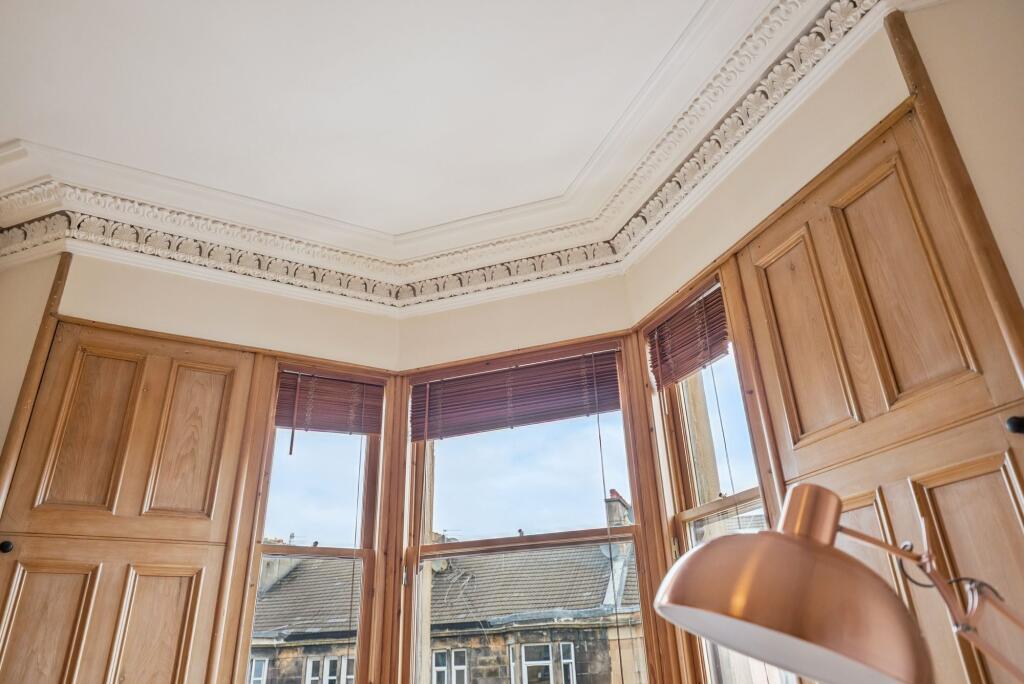 Positioned on the top floor of an attractive blonde sandstone tenement, this bright and spacious two-bedroom period apartment is located in the highly sought-after Queen’s Park district of Glasgow’s Southside.