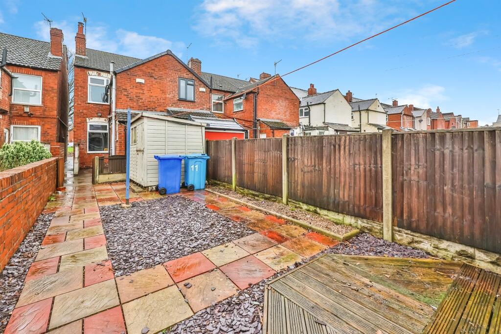 This is a two-bedroom end-of-terrace property located on The Triangle, in Ilkeston, Derbyshire. The property is listed for £140,000. The property is located close to local schools and amenities, with Ilkeston train station being 2.12KM away. The property has a good-sized garden with a shed. The property appears to be in a fair condition, with some rooms requiring some TLC. The bathroom has been modernised, but the kitchen could benefit from an upgrade. The property is a traditional build and would be ideal for a first-time buyer or investor.