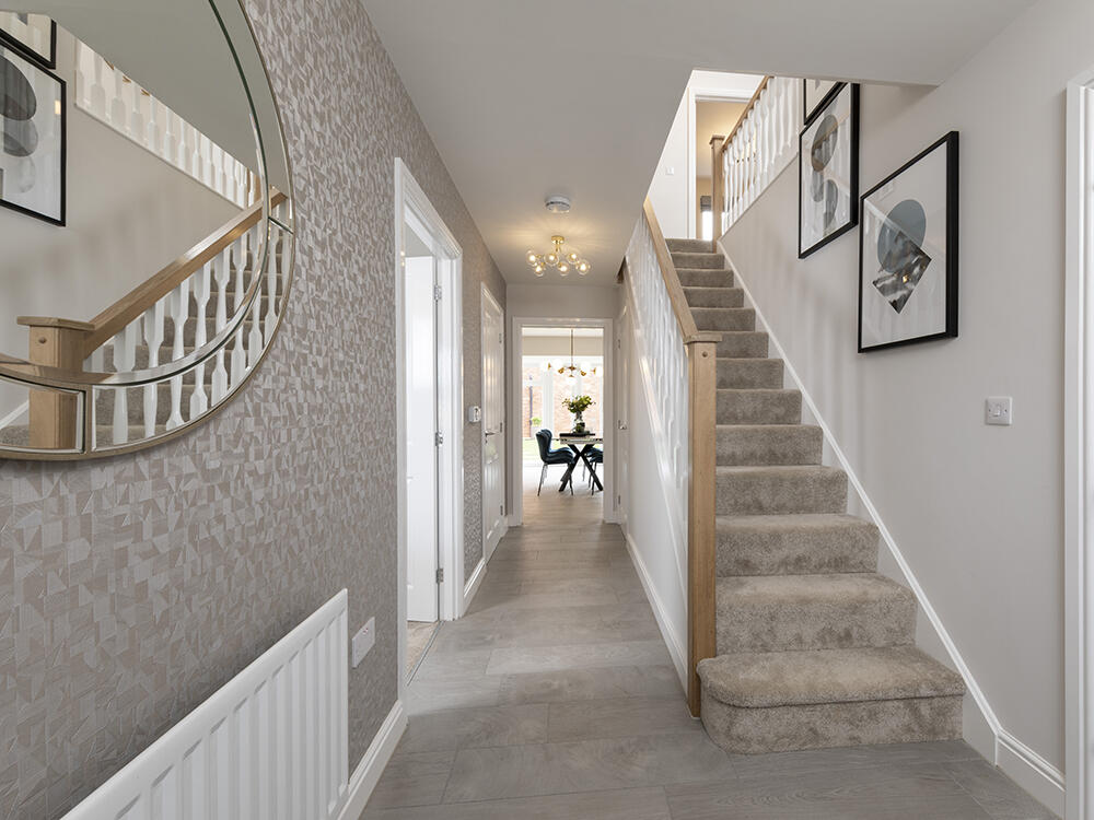 This 4-bed home with integral garage and block paved driveway features an open plan kitchen/dining/family area with peninsula island and French doors to the garden and patio. The main bedroom boasts a dressing area, there are two en-suites, and the main bathroom has a double ended bath and shower.