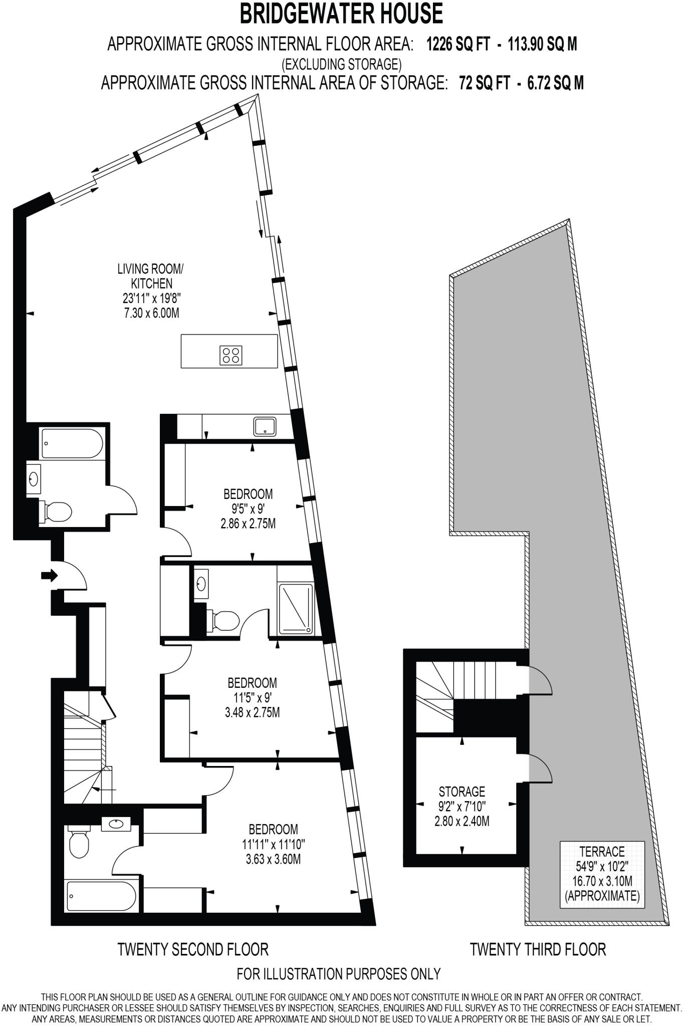 Bridgewater House is a penthouse apartment located in the Blackwall & Cubitt Town area of Tower Hamlets, London. The property benefits from a desirable location, with nearby transportation links including West Ham underground station (1.64km) and several Southeastern train stations within a 3-4km radius. Schools in the area include Star Primary School and St Luke’s Primary School, both rated as “Good” by Ofsted. The apartment itself is modern and well-presented, boasting three bedrooms and three bathrooms. Images show a contemporary design with high-quality fixtures and fittings. The property benefits from a spacious open plan living area and a private outdoor terrace offering panoramic views of the city. While the plot size is listed as 0.00 sqft, the terrace provides valuable outdoor space. The list price of £1,100,000 is above the average price for the area (£836,380), but considering the size (1226 sqft), the modern condition, and the desirable penthouse location with a terrace, the price appears reasonable, particularly when compared to other nearby penthouse listings.