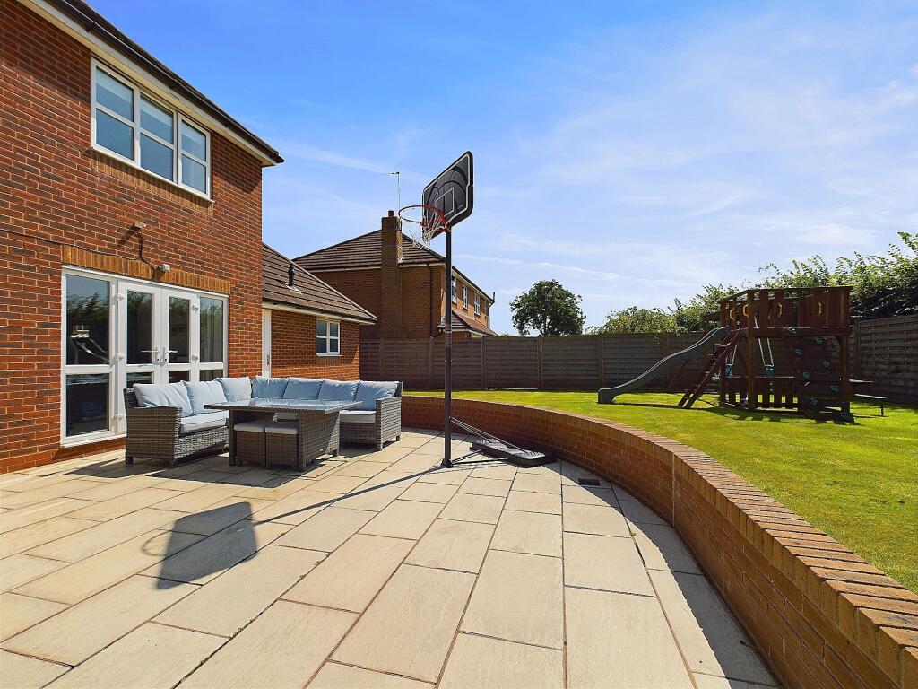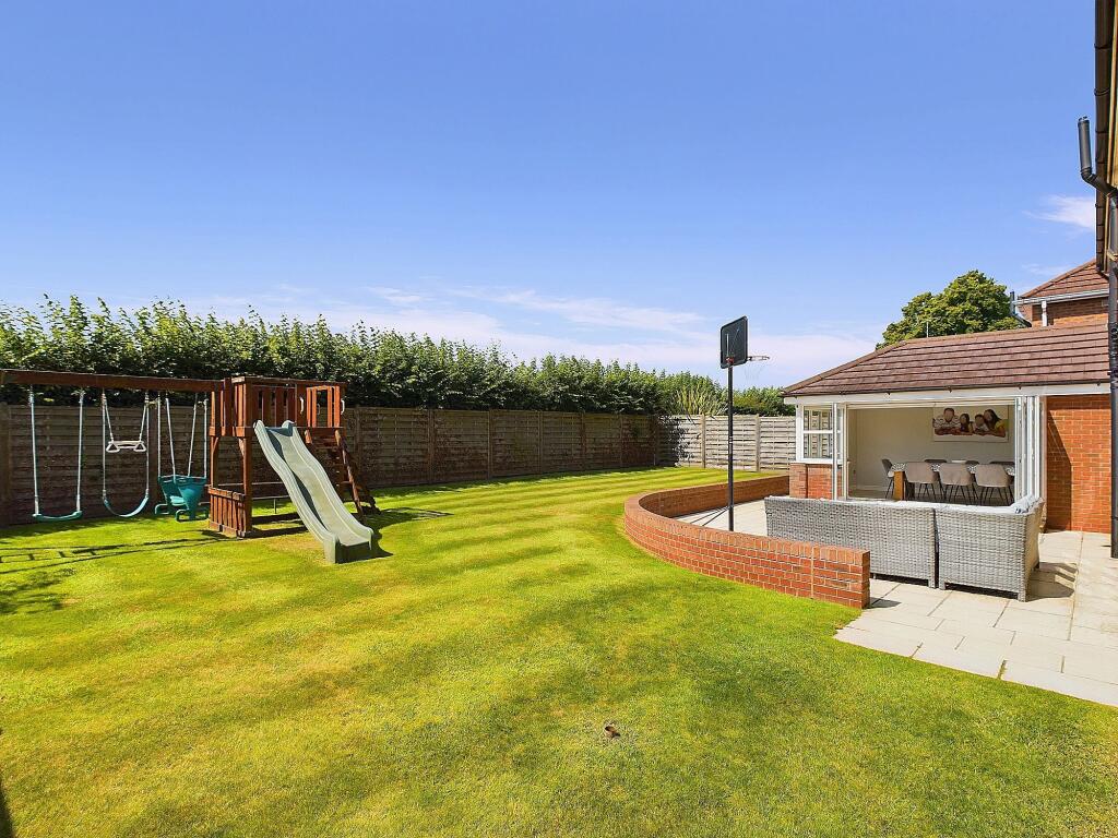 The property appears to be in excellent condition, with a modern kitchen and bathrooms. The interior is well-maintained and presented. The exterior is also in good condition, with a well-maintained garden and patio area. There is also a detached garage. The property benefits from a large garden with a patio area, ideal for entertaining. A children’s play area is also present, adding to the family-friendly appeal.