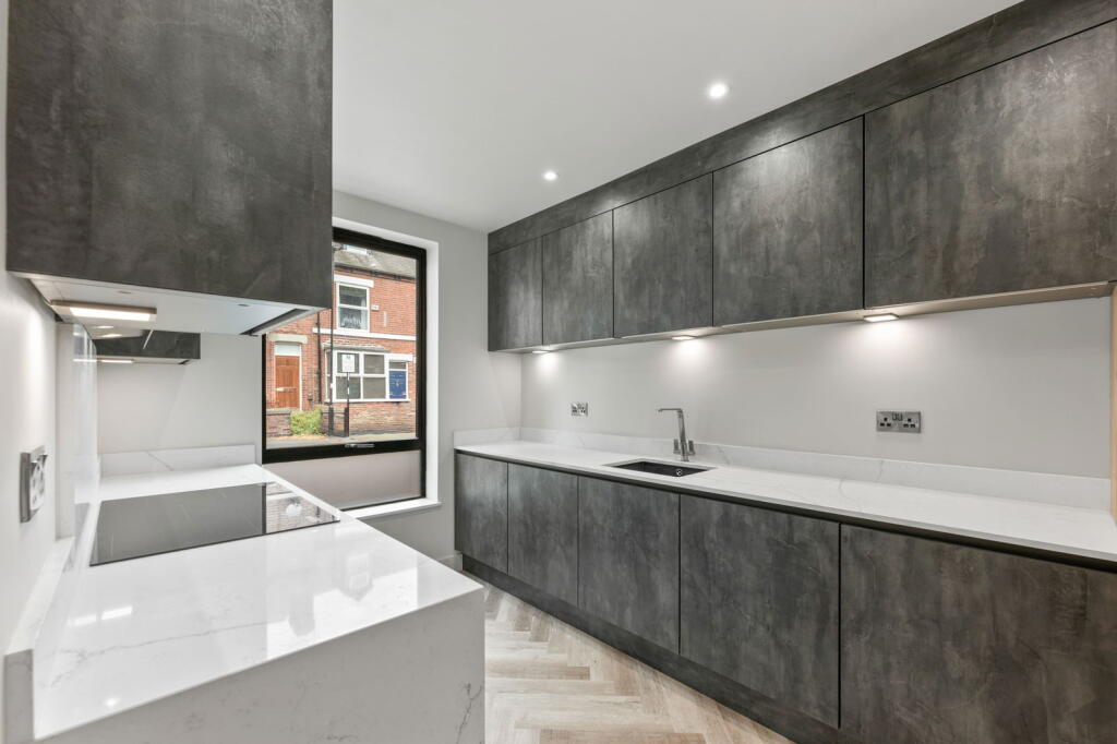 This property is a newly built, three-bedroom terraced house located on Stalker Lees Road in Sharrow Vale, Sheffield. The property boasts a modern design and high-quality fixtures and fittings throughout. The images reveal a contemporary kitchen with integrated appliances, a spacious open-plan living area with herringbone flooring and access to a private decked patio and roof terrace overlooking a leafy green space. The bedrooms are well-proportioned and benefit from modern en-suite bathrooms.