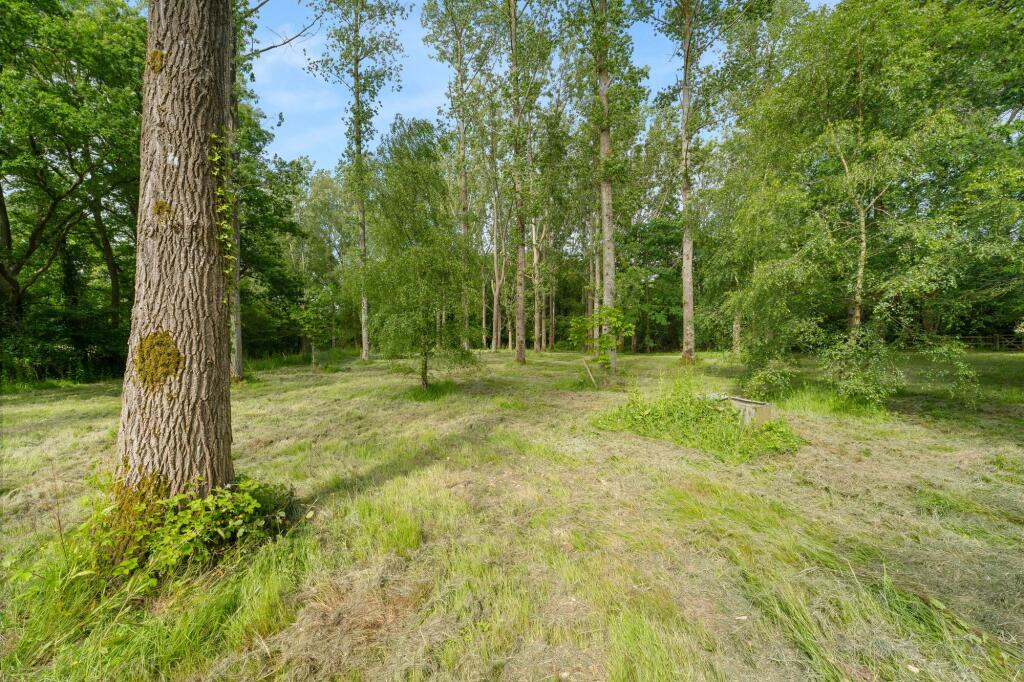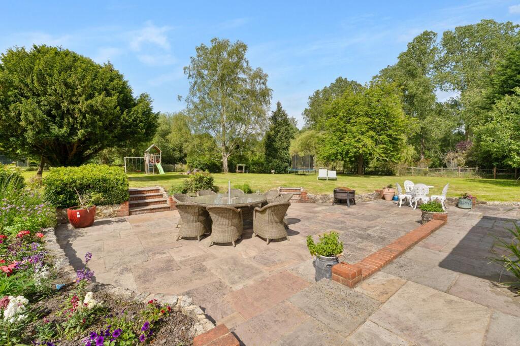 The property itself appears to be a substantial detached house, possibly a period property given its architectural features visible in the photographs. The images show a large garden with mature trees, a patio area, and outbuildings including a substantial garage/workshop and additional storage. The land appears extensive, providing ample space. The interior photos reveal exposed beams and fireplaces, characteristic of older properties, suggesting a traditional style with some modern updates to the kitchen and bathrooms. The overall condition appears good, although some areas might benefit from minor cosmetic upgrades.